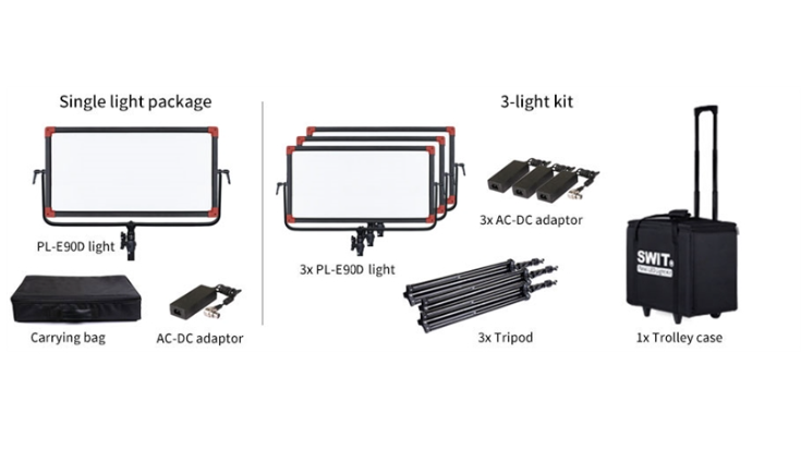 SWIT PL-E90D 3KIT je profesionální přenosné osvětlovací řešení určené pro vysílání, natáčení dokumentů, rozhovory a studiové aplikace. Každý LED panel PL-E90D využívá 480 SMD LED diod namontovaných na okrajích v kombinaci s jedinečnou technologií 90° světlovodu společnosti SWIT, která produkuje mimořádně měkké, jasné a rovnoměrně rozložené světlo při zachování tenkého a lehkého provedení.