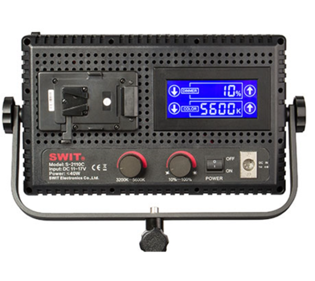 SWIT S-2110CS je kompaktní dvoubarevné LED panelové světlo o výkonu 40 W, které poskytuje až 1600 luxů na 1 metr, s plynulým nastavením barevné teploty od 3200 K do 5600 K. Díky 576 ultrajasným LED diodám, stmívání bez blikání a dotykovému LCD displeji je ideální pro rozhovory, studia, ENG a mobilní produkční sestavy. Podporuje napájení z baterie V-mount nebo adaptéru AC-DC.
