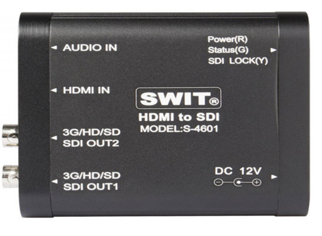 SWIT S-4601 je přenosný, odolný převodník HDMI na 3G/HD/SD-SDI s jedním vstupem HDMI a dvěma výstupy SDI. Podporuje vestavěný zvuk HDMI i externí analogový zvuk přes 3,5mm vstup, oba integrované do výstupu SDI. Je umístěn v robustním kovovém pouzdře se spodními šroubovými závity pro bezpečnou instalaci a je ideálním řešením pro profesionální vysílání, živou produkci a AV pracovní postupy.