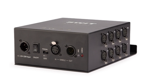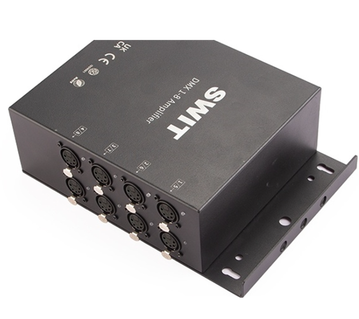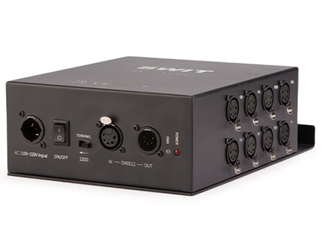 8kanálový převodník signálu DMX SWIT SA-D38 je profesionální zesilovač signálu DMX512 vyvinutý pro zajištění stabilního a spolehlivého řízení osvětlení v komplexních instalacích. Jeho primární funkcí je zesilovat a distribuovat signály DMX a zároveň chránit citlivá řídicí zařízení před elektrickými riziky, jako jsou vysokonapěťové zpětné připojení, zkraty lamp, přepětí způsobené bleskem a poruchy vedení.