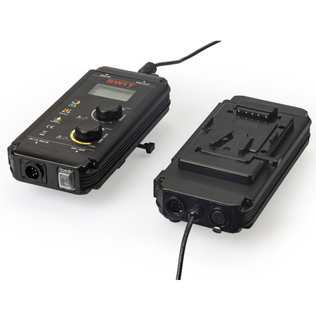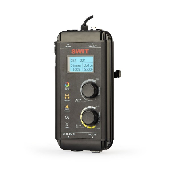 Řídicí jednotka světla SL-100P poskytuje knoflíky pro ovládání stmívače a teploty barev, LCD displej, desku pro montáž baterií do V, 4pólový XLR DC IN s širokým rozsahem 11-36 V, 5pólový XLR DMX IN a OUT a 5V USB výstup pro bezdrátový adaptér DMX.
