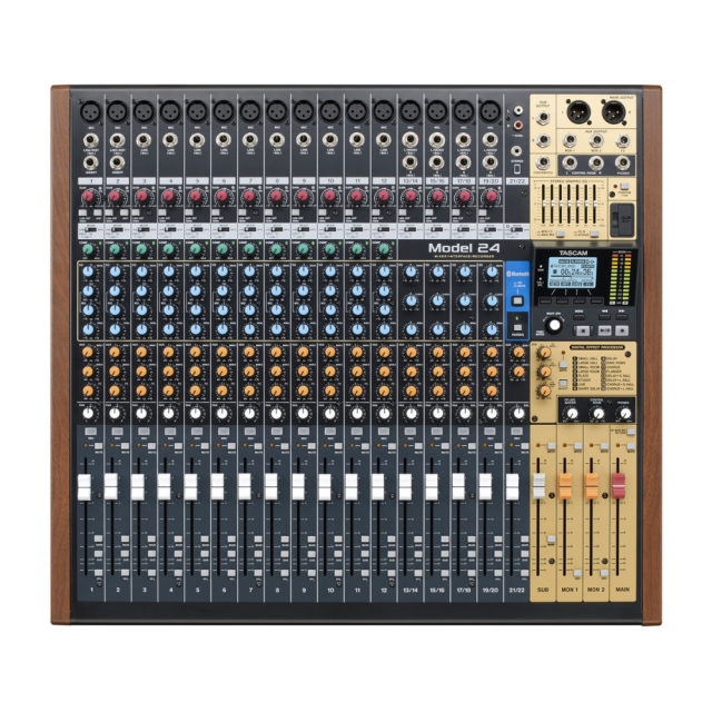 Kromě mikrofonních předzesilovačů studiové kvality a výkonných možností ekvalizéru a směrování je Model 24 vybaven vyhrazeným stereofonním kanálem 1/8", dvěma RCA a připojením Bluetooth™. To umožňuje uživatelům snadno integrovat mobilní zařízení do mixu pro přehrávání na zkouškách, hudbu v chůzi a další. V neposlední řadě může TASCAM Model 24 fungovat také jako výkonné audio rozhraní a připojuje se přímo k počítači PC nebo Mac pro snadnou integraci s vybraným DAW.