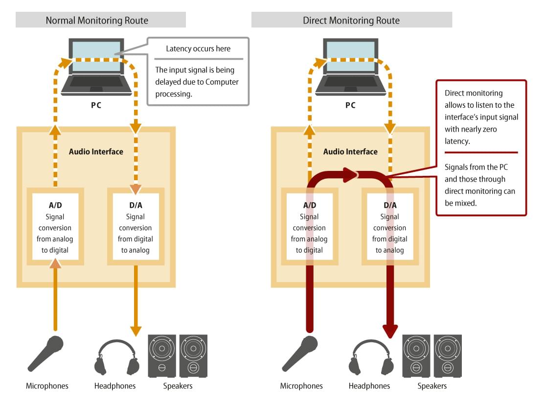 Při nahrávání zvuku pomocí počítače jsou vstupní signály obvykle vedeny přes rozhraní, počítač a poté zpět do výstupů rozhraní. Zatímco signály procházejí A/D a D/A převodníky v rozhraní bez znatelného zpoždění, zpracování zvuku počítačem může vést k jasně slyšitelnému, rušivému časovému zpoždění. Výsledkem je, že svůj hlas nebo nástroj uslyšíte později než doprovodné stopy přehrávané počítačem a jen stěží budete schopni hrát synchronizovaně s přehrávaným signálem.