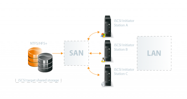 metaSAN iSCSI enables multiple servers to share access to a common iSCSI Target volume. It delivers all the same true SAN shared storage benefits as metaSAN, but tailored solution that leverages cost-effective Gigabit Ethernet technology.