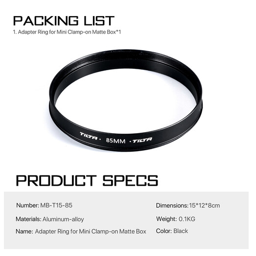 Tilta MB-T15-85 je lehký černý hliníkový adaptér, který se našroubuje na jakýkoli objektiv s předním filtrem o průměru 85 mm a umožňuje bezpečné připevnění matte boxu Tilta Mini Clamp-On Matte Box (MB-T15) při zachování použitelného filtru o průměru 85 mm na přední straně – ideální pro nasazení šroubovacích ND filtrů, CPL nebo efektových filtrů před připevněním matte boxu na kompaktní kinematografické nebo bezzrcadlové objektivy.