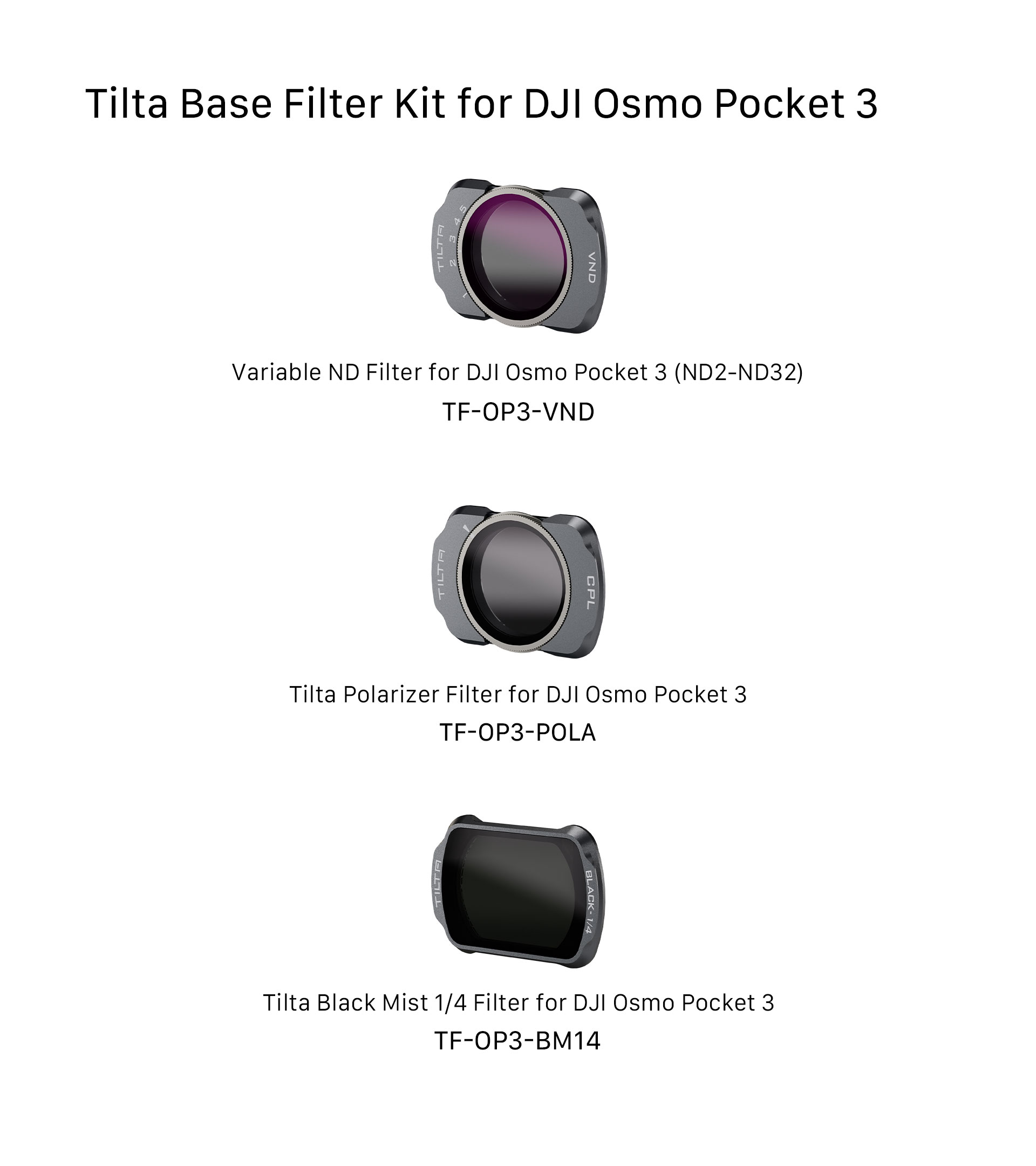 Tato sada obsahuje: 1x kruhový polarizační filtr, 1x černý mlhový filtr (1/4), 1x VND filtr (ND2-ND32). Filtry jsou navrženy na míru pro fotoaparát Pocket 3. Jsou vybaveny magnetickým připojením pro snadné připojení a drážkovaným designem Quick-Release, který umožňuje rychlý přístup k filtrům stisknutím a vyjmutím.