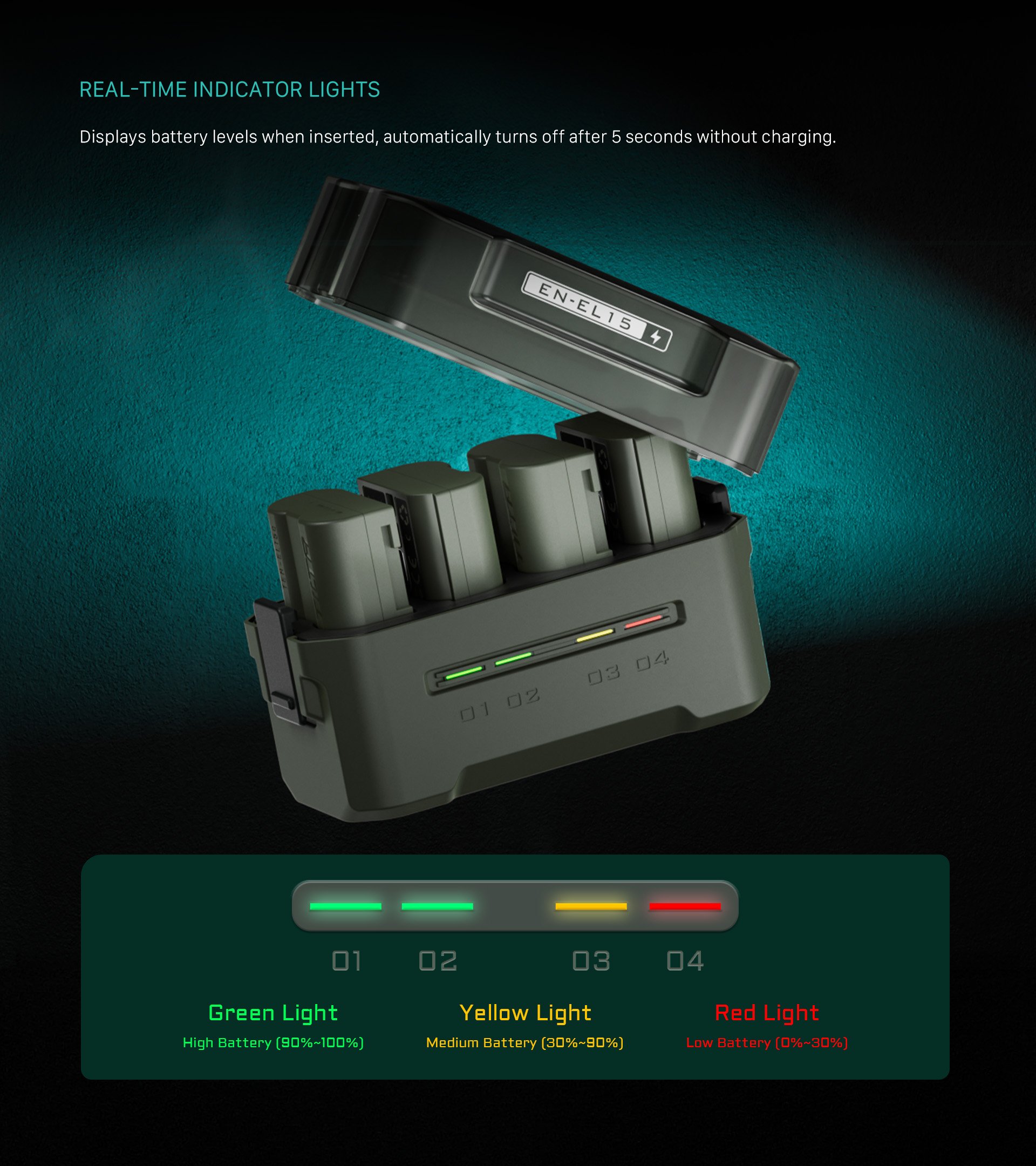 Tato kompaktní nabíjecí stanice je navržena pro podporu baterií EN-EL15C od společnosti Nikon a jiných výrobců a nabízí čtyři sloty pro snadné nabíjení a pohodlné skladování.