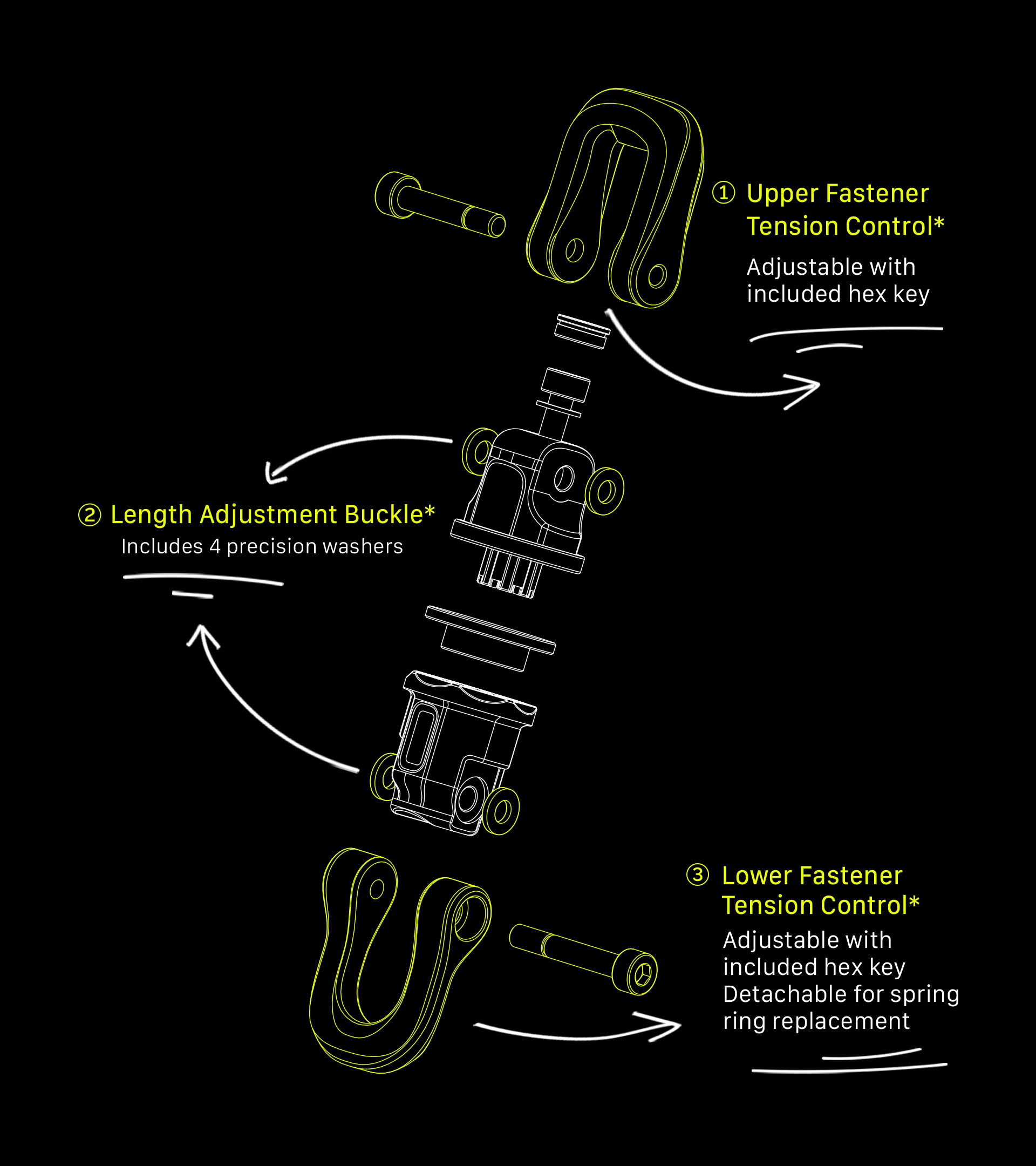 Intuitivní spona umožňuje snadné a rychlé nastavení délky pro různé konfigurace a pokročilé magnetické rychloupínací spony využívají technologii Fidlock HOOK pro extrémní flexibilitu.
