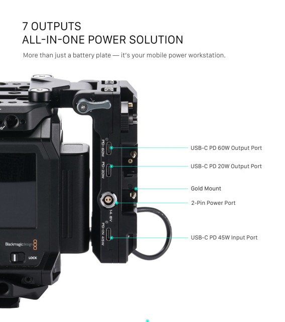 Tato bateriová deska s rozhraním V-Mount se připevňuje přímo na náš kamerový rám pro Blackmagic PYXIS 6K/12K a je vybavena několika výstupními porty, jako jsou PD USB-C, P-Tap a 2-pinový konektor, a také vstupem PD USB-C.