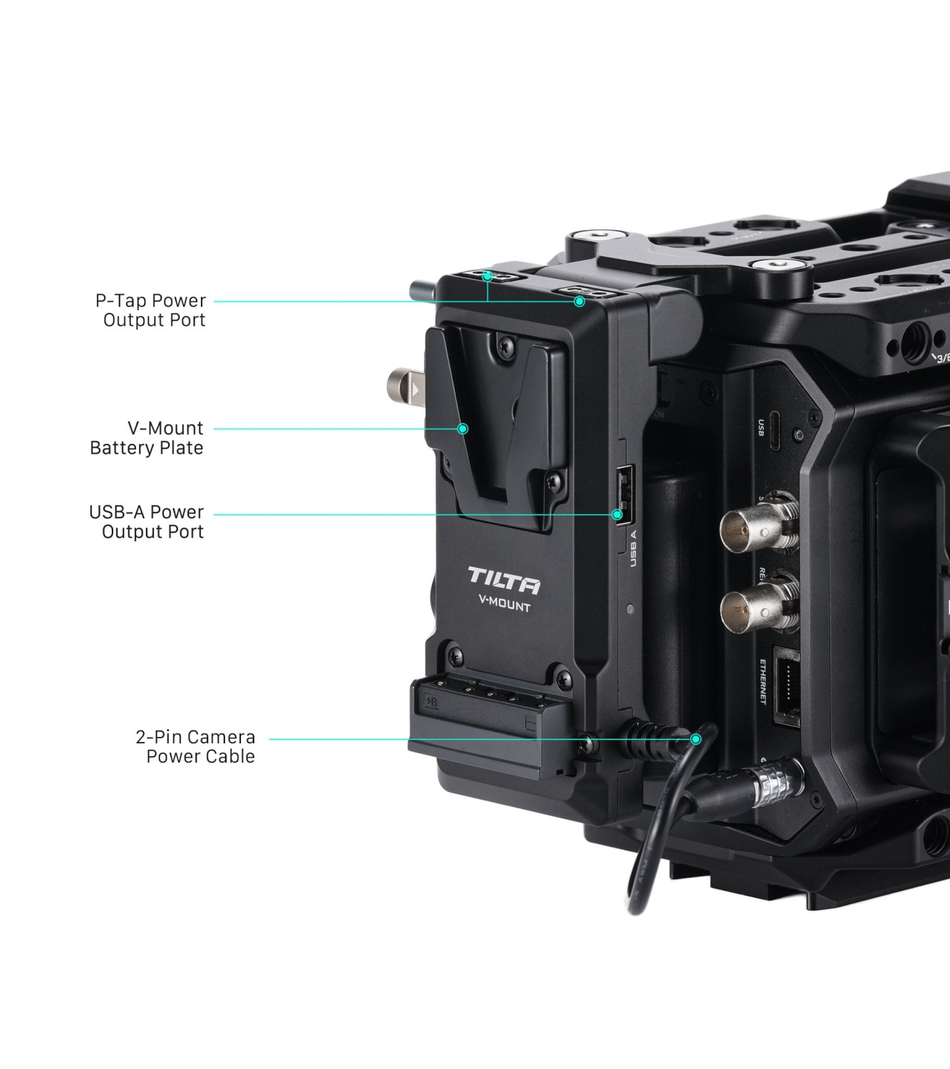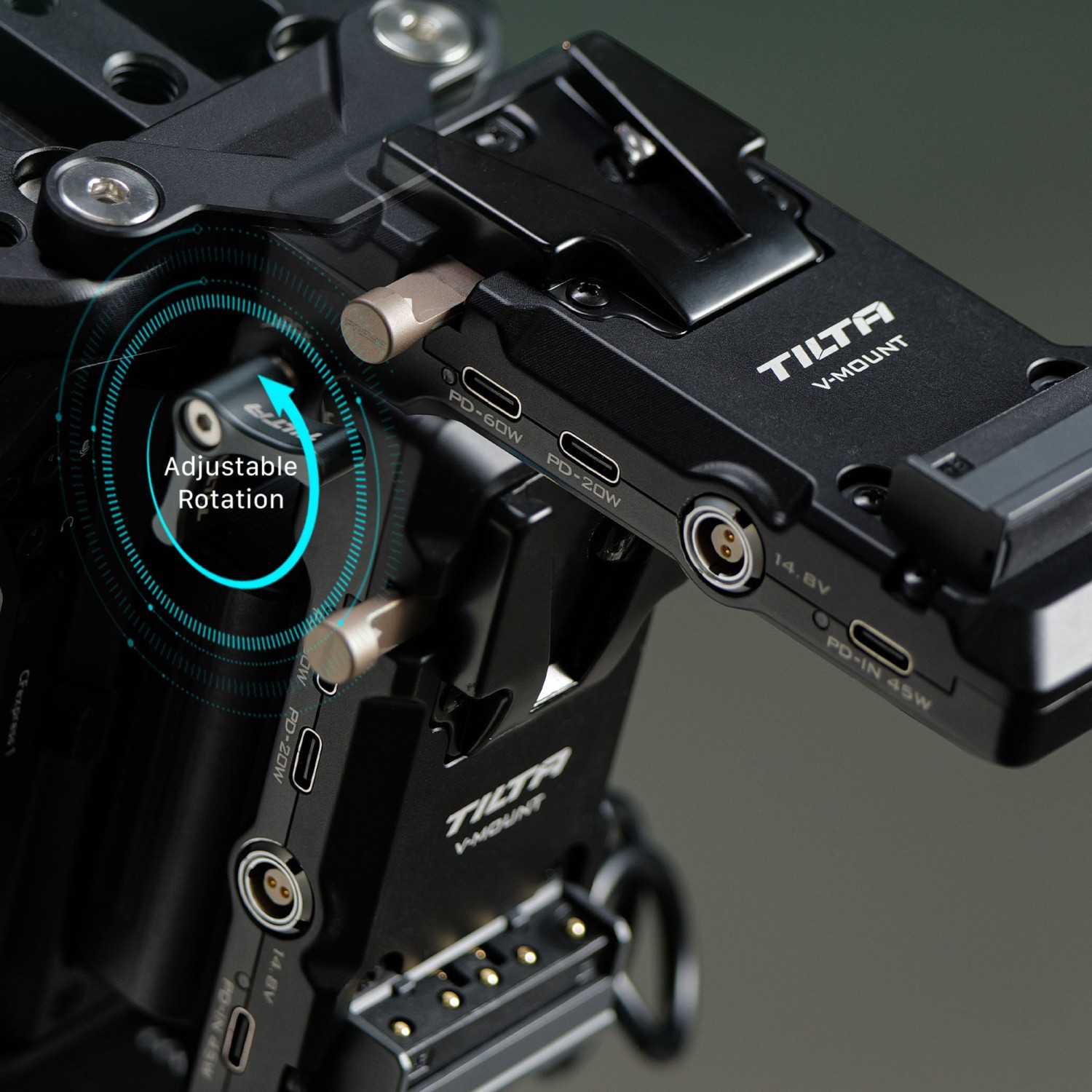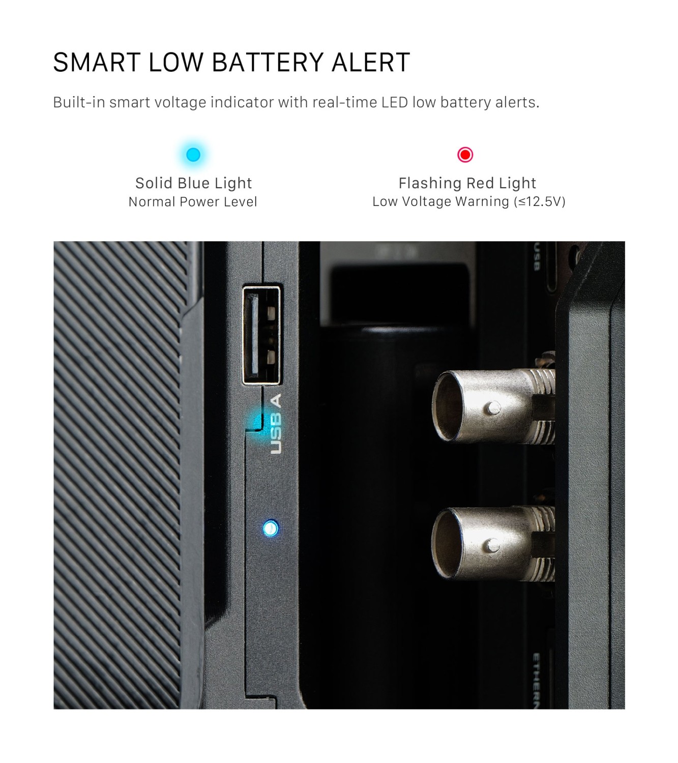 Vstup USB-C je obzvláště užitečný, protože umožňuje uživatelům napájet bateriovou desku a veškeré připojené příslušenství bez nutnosti připojení baterie V-Mount, což je ideální pro výměnu za chodu nebo montáž kamery v lehčích konfiguracích.