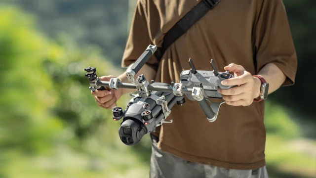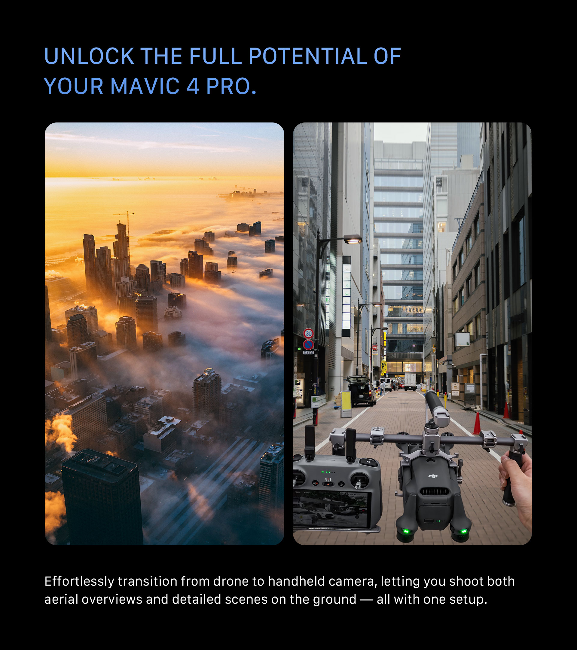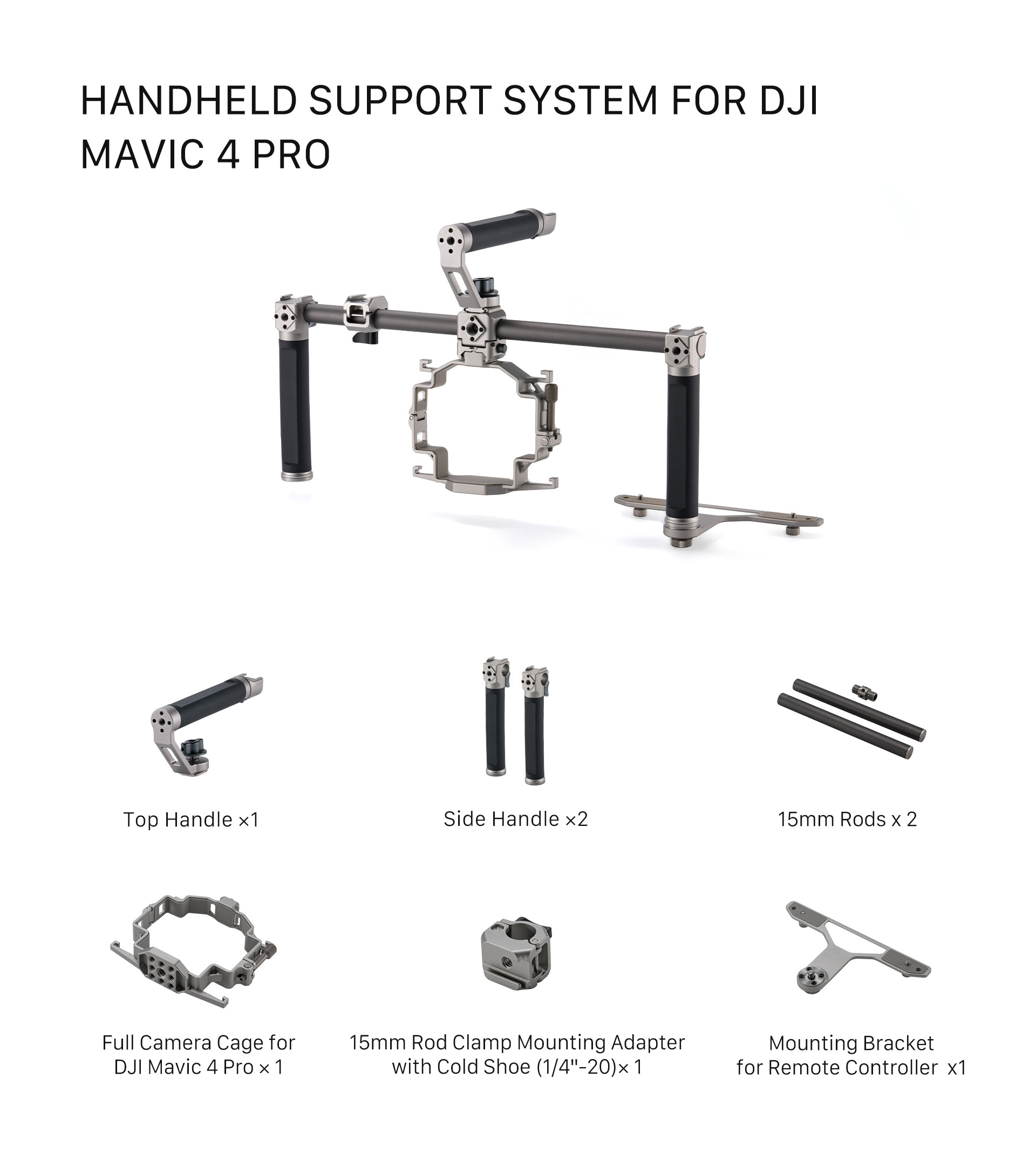 Tento ruční podpůrný systém otevírá nové kreativní možnosti tím, že promění váš dron v plně funkční ruční kamerový rig. Tento speciálně navržený kamerový rám je ideální pro filmaře, tvůrce obsahu a produkční týmy na cestách a nabízí stabilní a ergonomické řešení pro pozemní natáčení s Mavic 4 Pro.