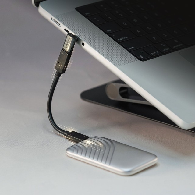 Díky univerzálnímu designu je adaptér kompatibilní s většinou portů a příslušenství USB-C, což ho činí univerzálním pro zařízení jako smartphony, fotoaparáty a notebooky. 90stupňový úhlový konektor poskytuje větší flexibilitu, snižuje namáhání kabelů a umožňuje čisté připojení bez napětí v těsných prostorech nebo přeplněných zařízeních.