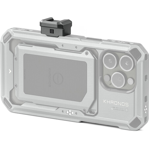 Rychloupínací adaptér Tilta Khronos Cold Shoe ve vesmírně šedé barvě umožňuje připevnit tradiční příslušenství fotoaparátu na iPhone 15 Pro nebo Pro Max pomocí pouzdra Khronos. Pevně se upevňuje pomocí uzamykací svorky a poskytuje univerzální řešení pro rozšíření vašich mobilních filmařských možností.