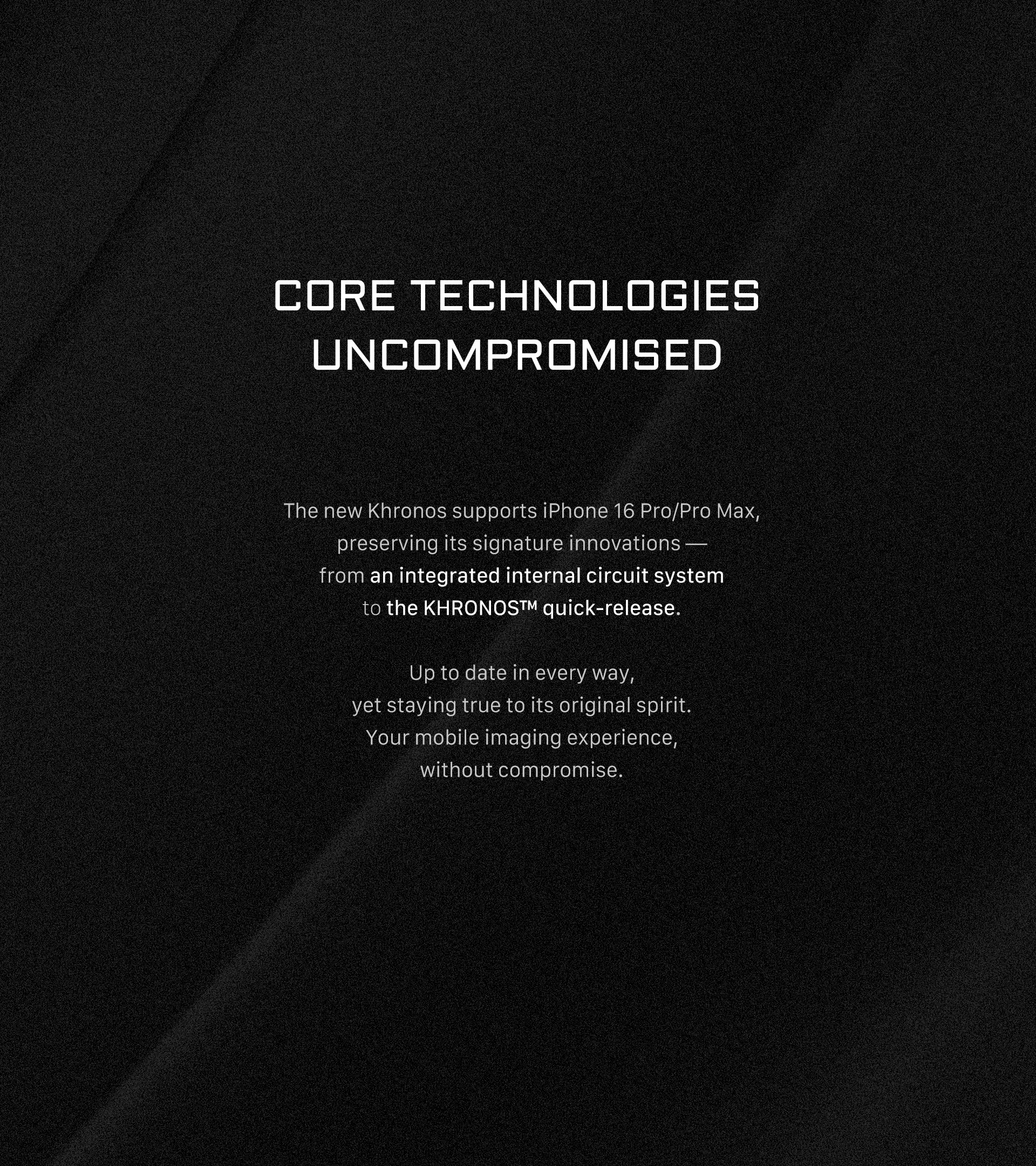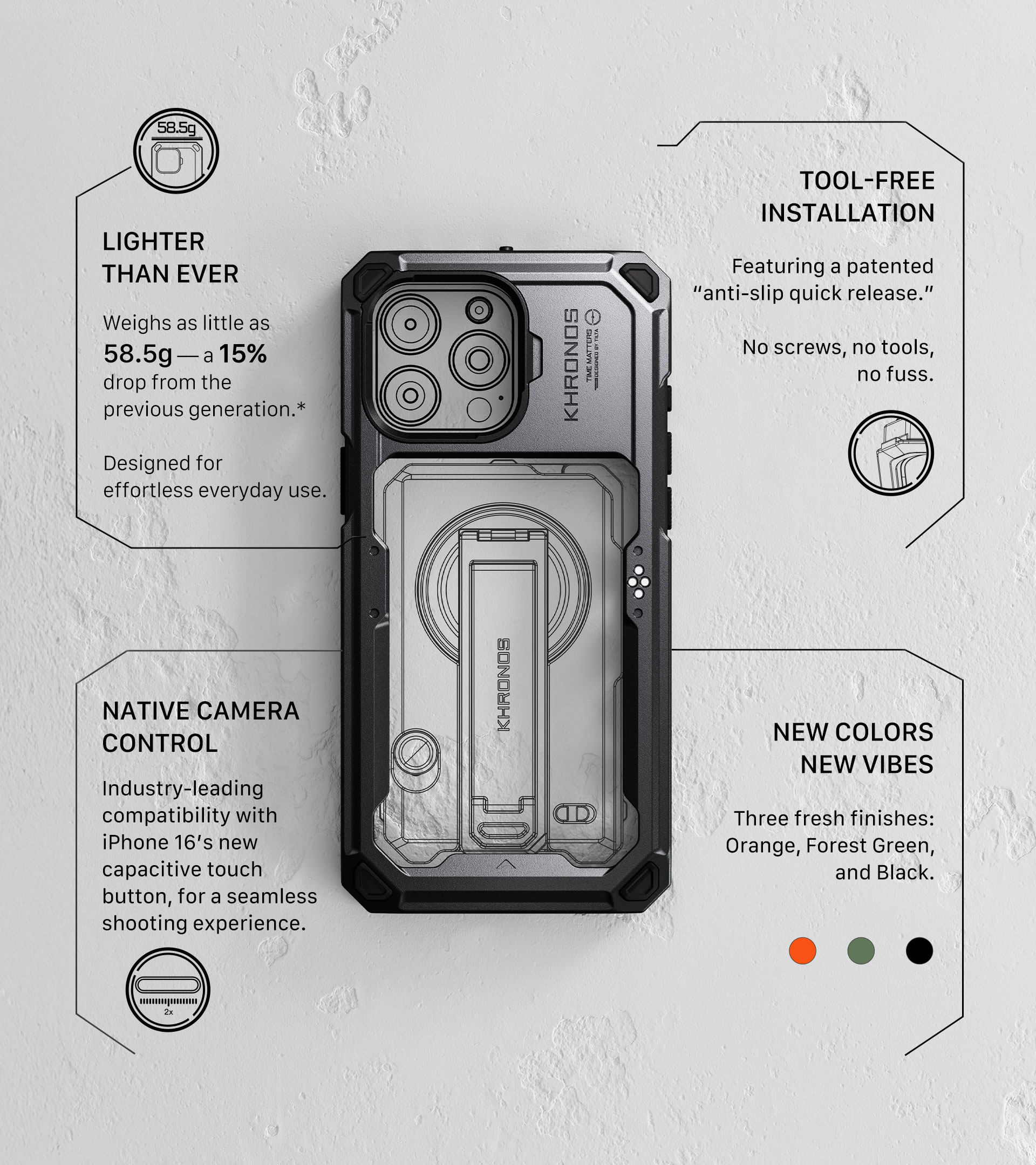 Zažijte natáčení jako nikdy předtím s pouzdrem Khronos pro iPhone 16 Pro / Pro Max - kde se inovace setkává s vášní.