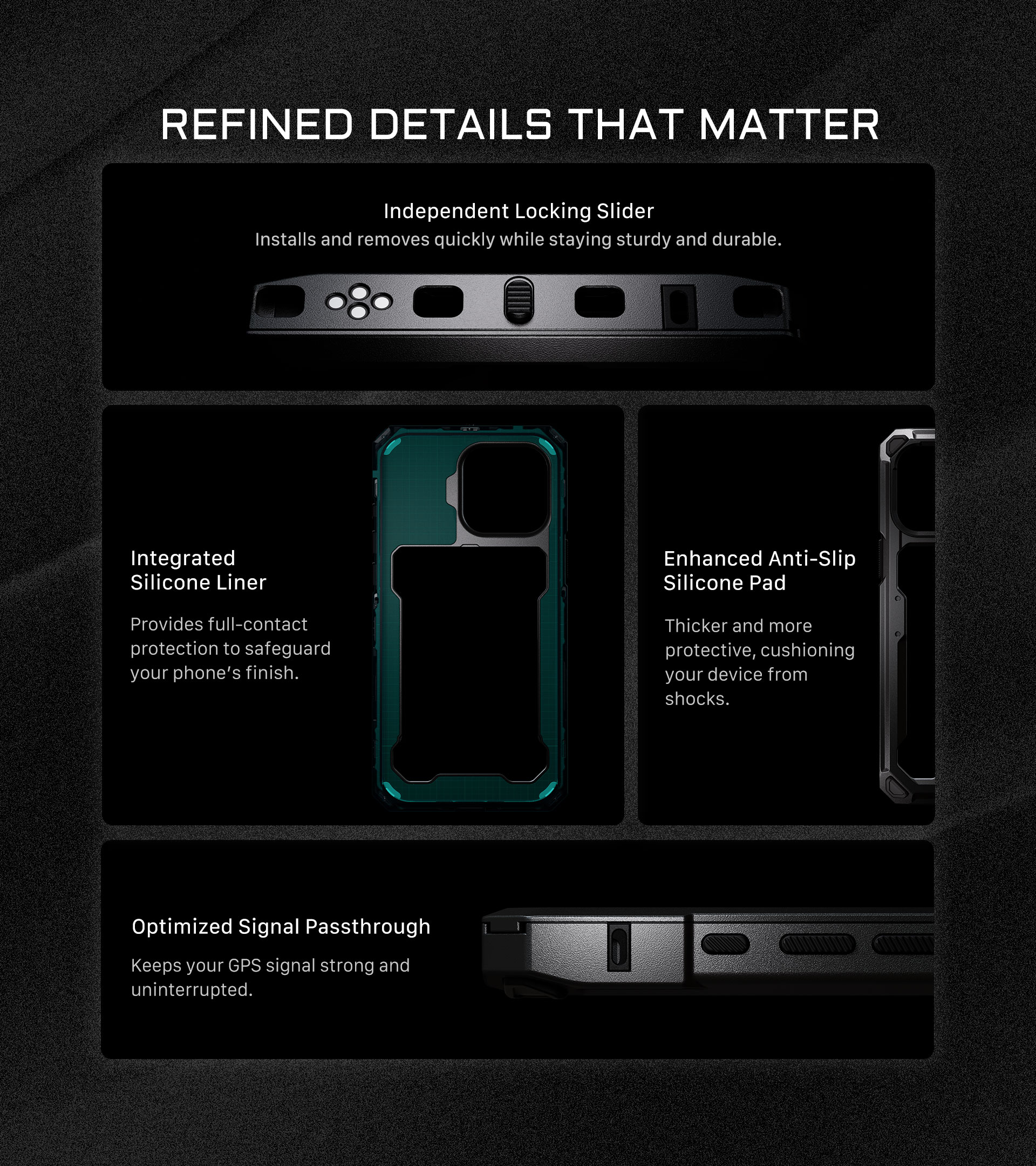 Instalace je snadnější než kdykoli předtím, protože toto aktualizované pouzdro je vybaveno rychloupínacím zacvakávacím designem, který uživatelům umožňuje pouzdro rychle instalovat nebo sejmout a zároveň zajišťuje, že veškeré připojené příslušenství zůstane bezpečně připevněno.