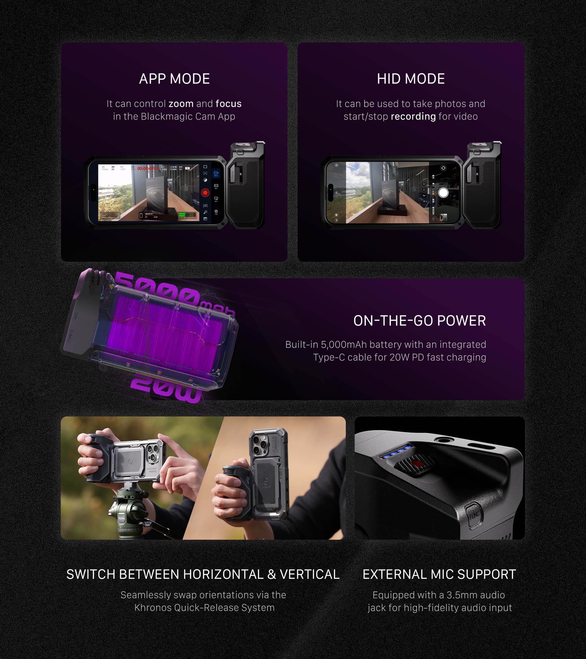 Rukojeť se připojuje k iPhonu 16 pomocí integrovaného kabelu USB-C a využívá Bluetooth k ovládání ostření nebo zoomu pomocí voliče na přední straně rukojeti. To také zajišťuje větší stabilitu při ovládání systému a tlačítko pro nahrávání zajišťuje, že uživatelé nemusí rukojeť pustit, aby mohli začít nahrávat.