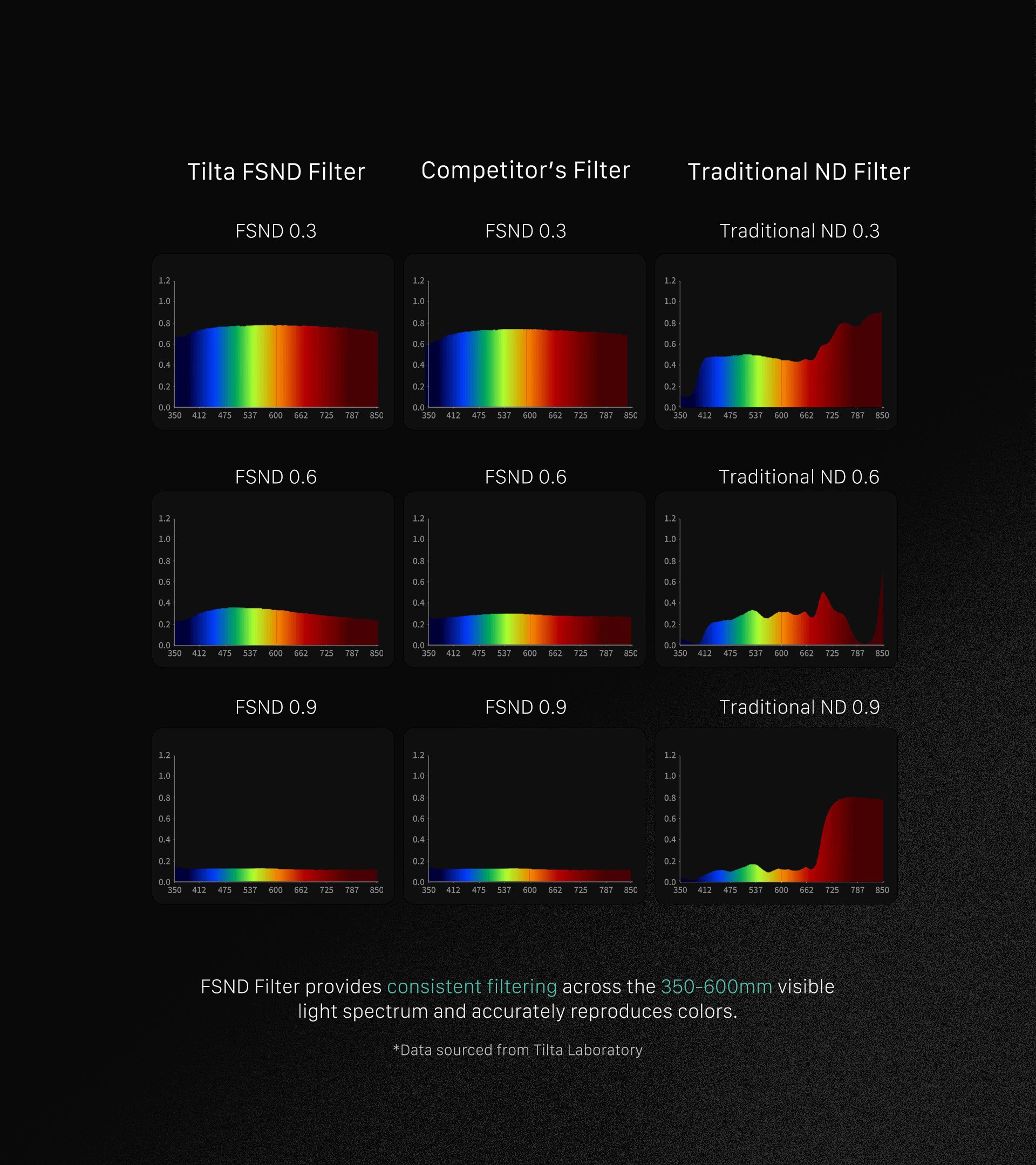 Přiložené ND filtry poskytují větší kontrolu nad expozicí tím, že umožňují uživatelům snížit množství světla viditelného pro snímač, což také pomáhá udržet konstantní rychlost závěrky při fotografování v prostředí s jasnějším osvětlením, jako je denní světlo.