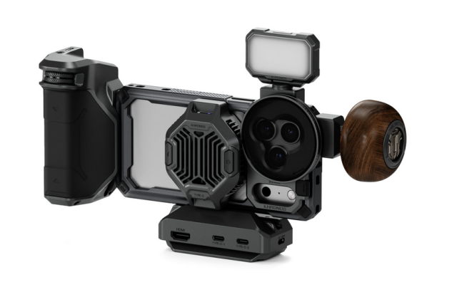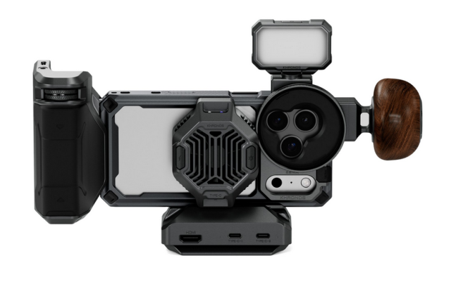 Řízení teploty: Chladicí systém V2 pro Khronos je 22W chladič s proměnnou frekvencí, který se připevňuje magneticky (kompatibilní s MagSafe) a pomáhá omezit přehřívání během dlouhých nahrávacích relací a současně bezdrátově nabíjí iPhone.