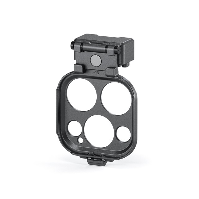 Zásobník je vybaven otočným držákem, který umožňuje, aby zásobník spadl na místo nad všemi třemi objektivy zařízení iPhone 16 Pro/Pro Max.