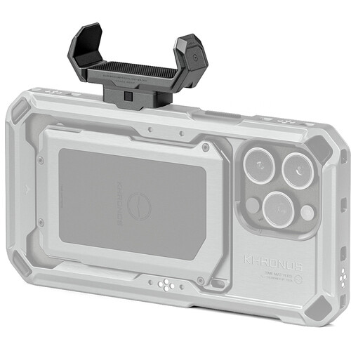 Univerzální držák SSD Tilta Khronos ve vesmírně šedé barvě umožňuje pohodlně připojit externí SSD disk nebo jiné příslušenství k pouzdru Khronos pro iPhone, které je kompatibilní s iPhonem 15 Pro nebo Pro Max. Pojme zařízení o šířce od 1,96 do 2,75 palce a výšce až 0,59 palce.