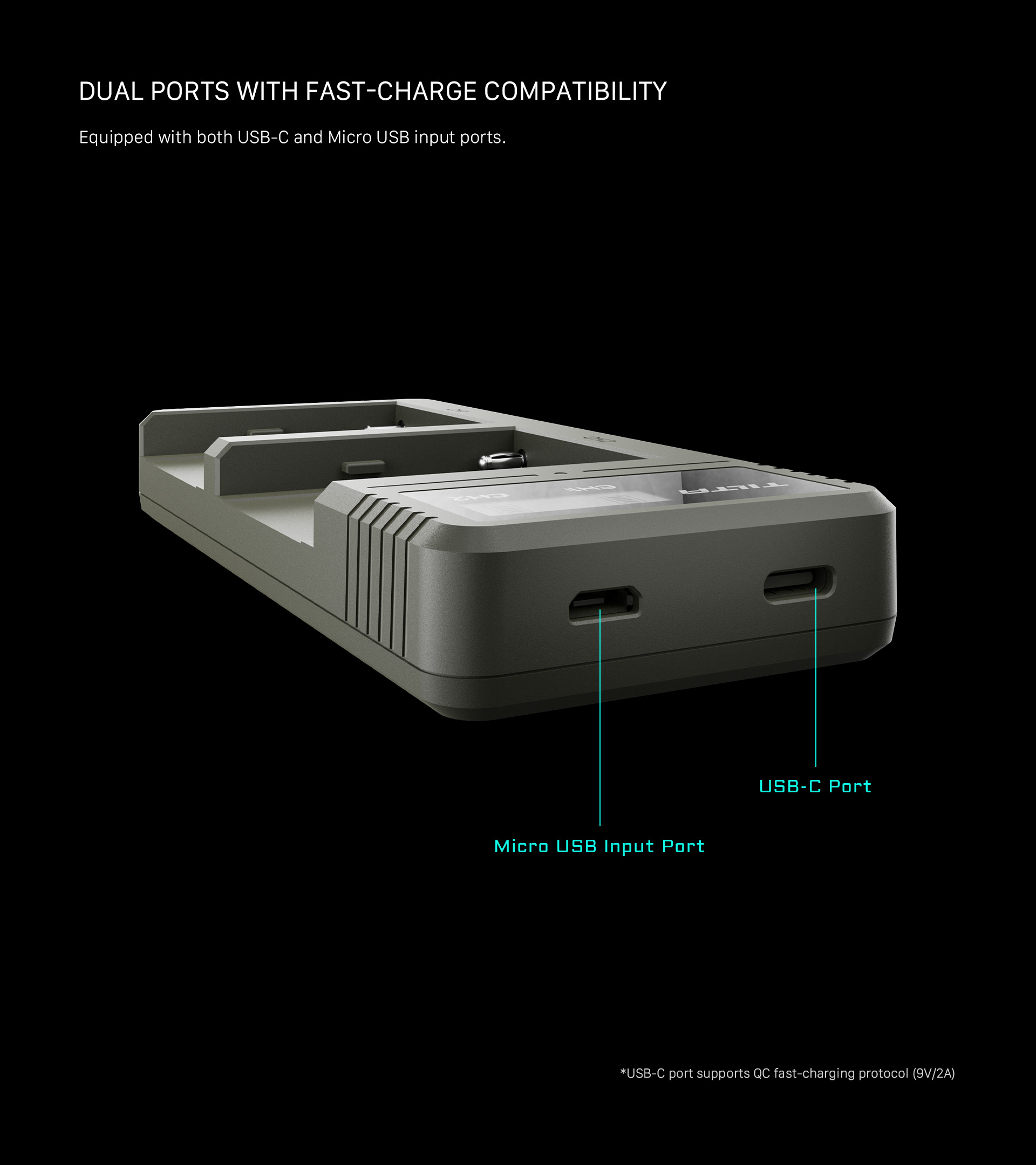 Tato ultrakompaktní nabíječka je navržena tak, aby podporovala širokou škálu baterií Sony řady L / NP-F a kompatibilních baterií třetích stran, včetně NP-F550, NP-F750, NP-F970, NP-FM50, NP-FM550H a dalších.