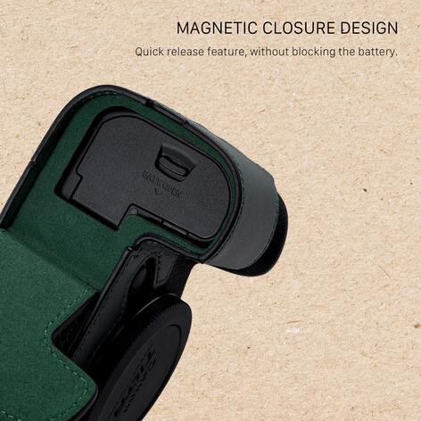 Tilta TA-T68-LCC-B kombinuje nadčasovou eleganci s praktickou ochranou. Pružná černá kůže nejvyšší kvality obepíná spodní část a boky fotoaparátu a poskytuje odolnost proti poškrábání a nárazům, aniž by omezovala přístup k bočním portům, slotům pro karty nebo výklopnému displeji. Chytře navržená magnetická klapka na spodní straně se během několika sekund otevře, takže můžete vyměnit baterii nebo kartu, aniž byste museli pouzdro sundávat, zatímco zesílený 1/4"-20 hliníkový závit umožňuje přímé připevnění na stativ. Integrovaná kožená rukojeť nabízí vylepšenou ergonomii pro ruční fotografování, zejména během dlouhých videozáznamů nebo v horkých/chladných podmínkách. S hmotností pouhých 50 g (1,76 oz) je pouzdro lehké jako pírko, ale přesto působí robustně, což z něj dělá perfektní kombinaci luxusu a funkčnosti pro fotografy a filmaře, kteří chtějí chránit svůj fotoaparát R5 Mark II stylově.