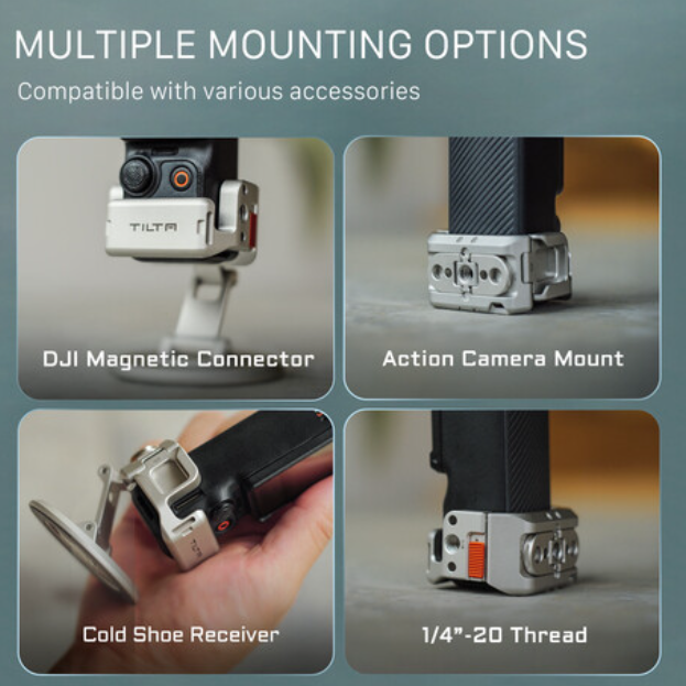 Sada magnetických držáků příslušenství Tilta pro DJI Osmo Pocket 3 nabízí univerzální magnetické a mechanické možnosti upevnění, několik bodů pro připevnění příslušenství, plný přístup k fotoaparátu a kloubové polohování – to vše v elegantním titanově bílém provedení. Tato sada je ideální pro tvůrce, kteří potřebují kompaktní, ale vysoce přizpůsobivé řešení pro upevnění, a nabízí prvotřídní univerzálnost s čistým, moderním designem.