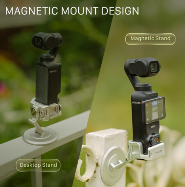 Magnetický montážní stojan Tilta TA-T65-MMS-TW (titanově bílá) je elegantní, ultrakompaktní hliníkové rameno s dvojitým kloubem, které bylo navrženo exkluzivně pro DJI Osmo Pocket 3. Kombinuje okamžité magnetické připevnění se standardní základnou se závitem 1/4"-20 a nabízí naklonění horní části o 270° a otočení spodní části o 180°, což umožňuje neomezené kreativní úhly při stolním, nízkém nebo rigged nastavení.