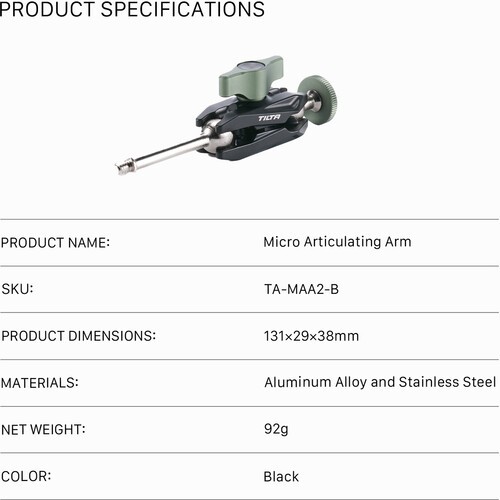 Kloubové rameno Tilta Micro je ideálním doplňkem pro filmaře, kteří potřebují přidat malé příslušenství ke své kamerové sestavě s flexibilním umístěním. Toto 5,2palcové kloubové rameno je vyrobeno z vysoce kvalitní hliníkové slitiny a nerezové oceli a poskytuje silnou a spolehlivou podporu pro vaše vybavení s maximální nosností 5 liber (2,3 kg). Rameno je na obou koncích vybaveno 1/4"-20 šroubem, díky čemuž je kompatibilní s celou řadou příslušenství, jako jsou monitory na kameře, hledáčky a malá doplňková světla. Konstrukce zahrnuje dva kloubové body pro snadné a přesné nastavení v jedinečných úhlech. Jedna strana ramena je mírně delší, aby se zabránilo překážkám od ostatních příslušenství, která již máte na svém zařízení. Díky lehké konstrukci o hmotnosti pouhých 92 g a kompaktní velikosti se snadno vejde do jakékoli brašny na fotoaparát.