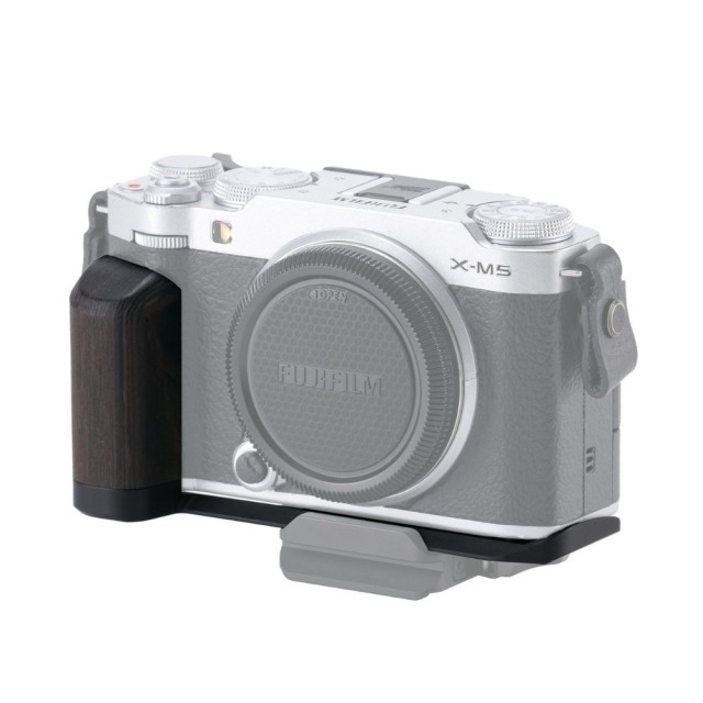 Toto příslušenství ve tvaru L-držáku je vybaveno dřevěným gripem z ořechového dřeva, který zajišťuje pohodlnější ovládání a držení fotoaparátu Fujifilm X-M5.