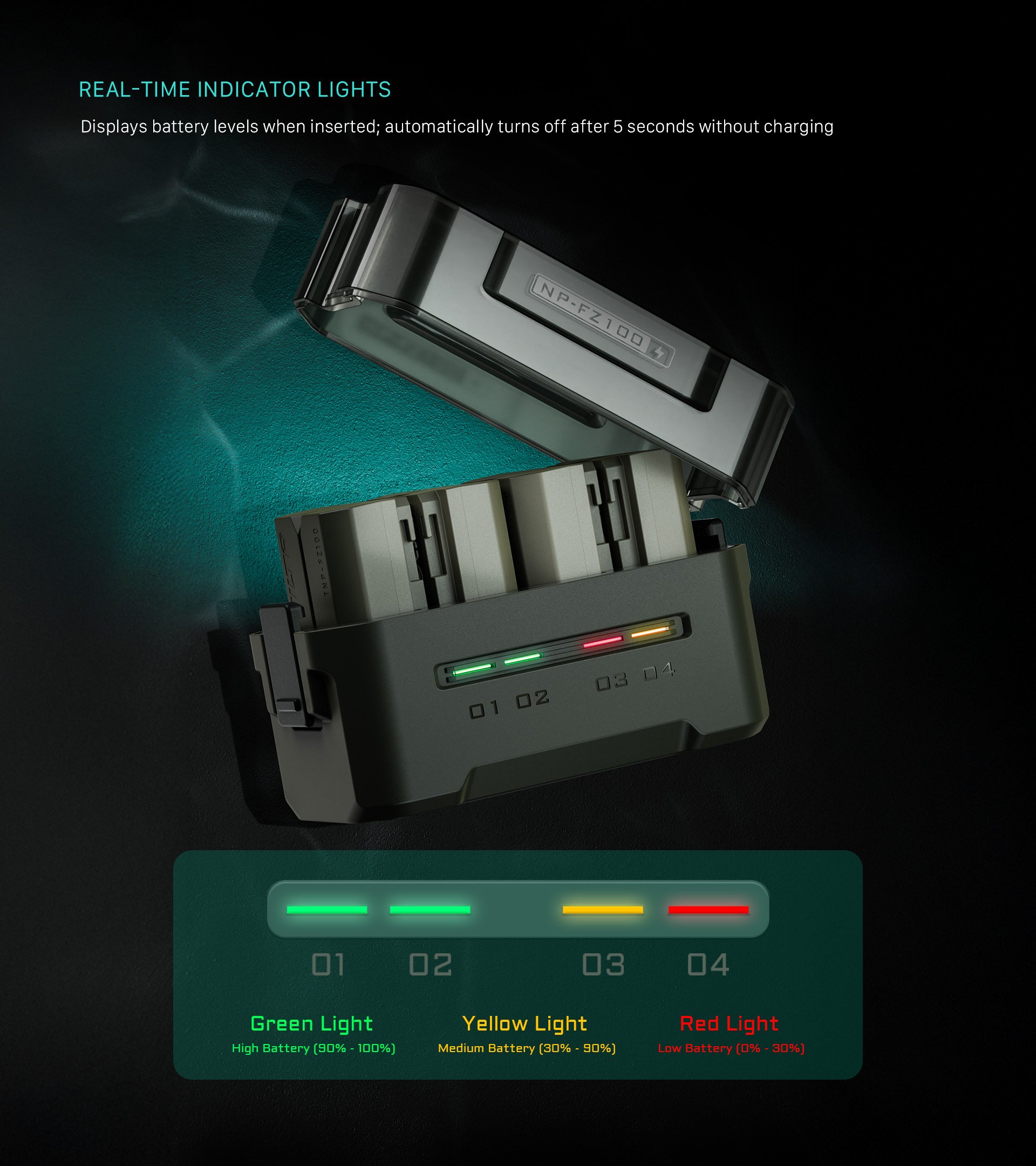 Tato kompaktní nabíjecí stanice je navržena pro podporu baterií Sony a jiných výrobců NP-FZ100 a nabízí čtyři sloty pro snadné nabíjení a pohodlné skladování.