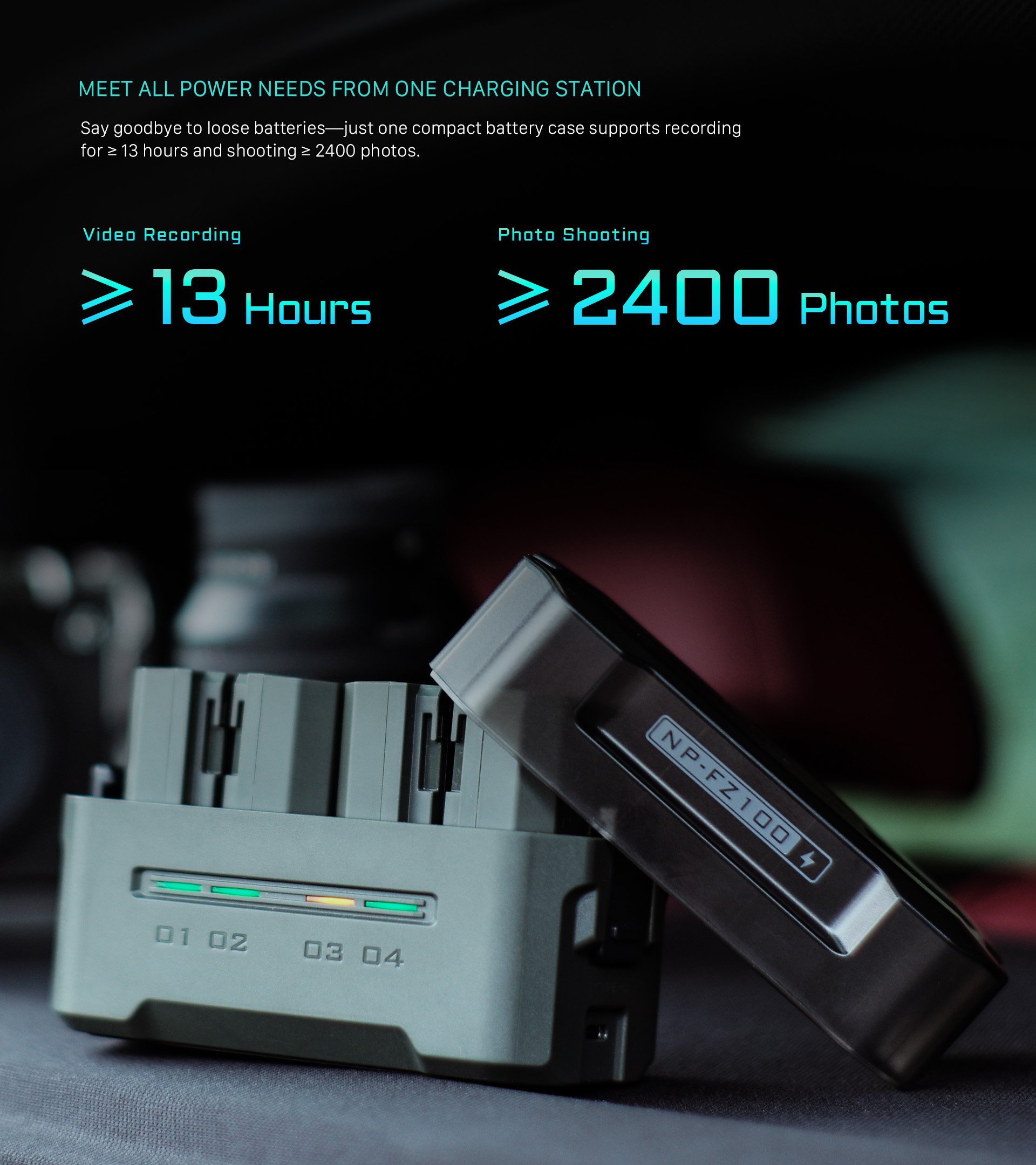 Díky možnosti plně nabít čtyři baterie NP-FZ100 budou uživatelé připraveni až na 13 hodin záznamu videa nebo dostatek energie pro zpracování 2 400 fotografií, což je ideální pro dlouhé fotografování.