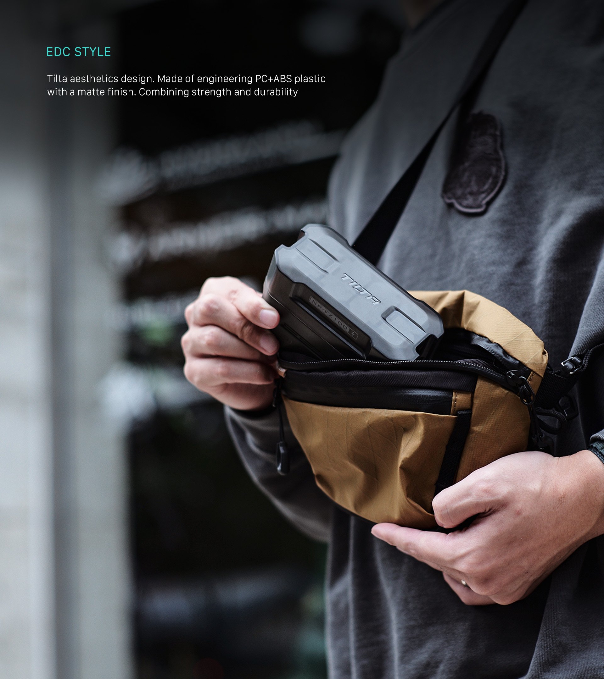 Přenosná nabíjecí stanice Tilta má design ve stylu EDC s charakteristickou estetikou značky Tilta, takže je stylovým a funkčním doplňkem vaší výbavy.