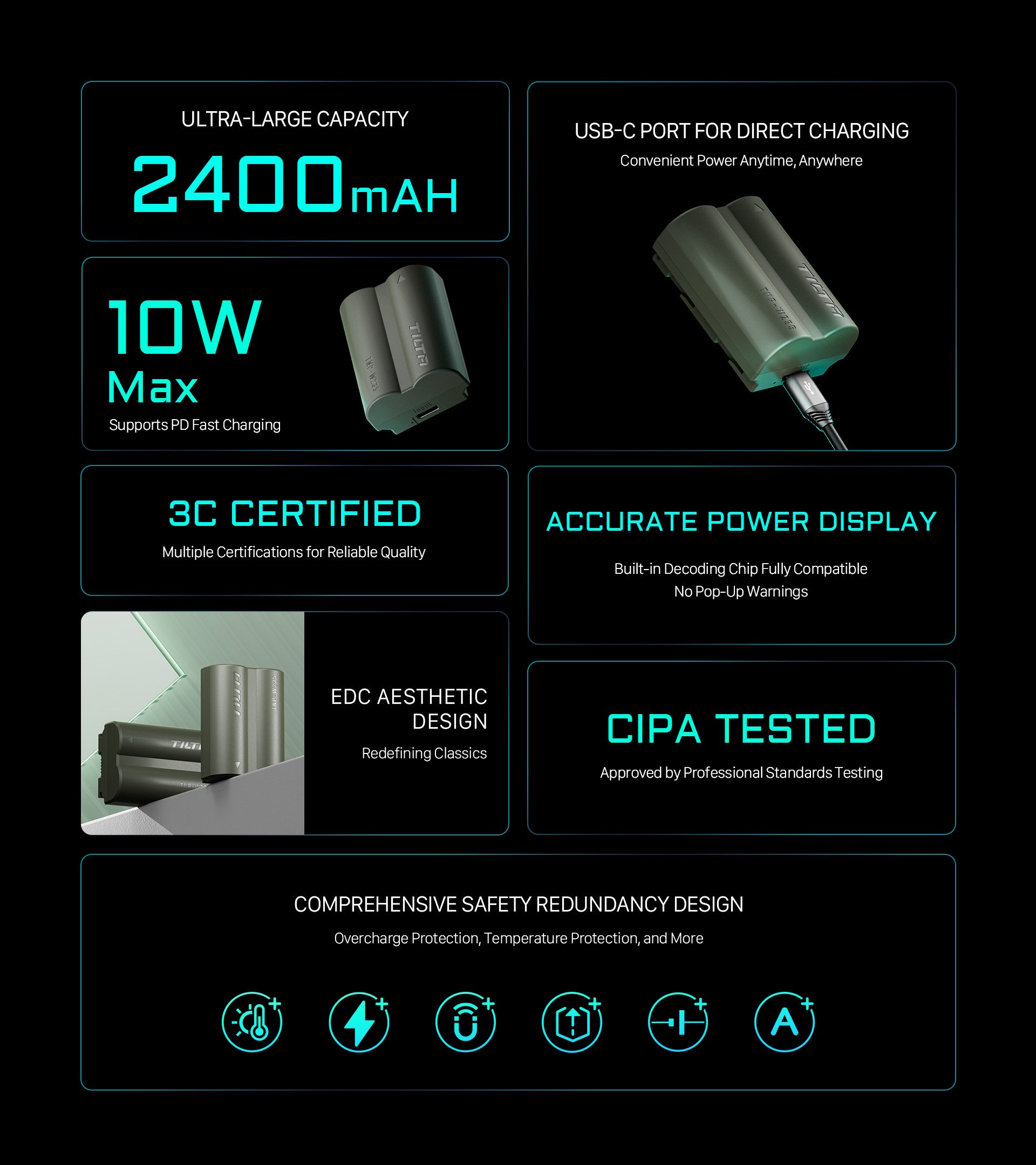 Díky rozměrům odpovídajícím originálu se bez problémů vejde do fotoaparátu a zajistí dokonalou kompatibilitu. Je také vybavena několika mezinárodními bezpečnostními certifikacemi (CCC, FCC, CE, PSE, KC, UL, BSMI), takže nabízí klid a spolehlivou ochranu.