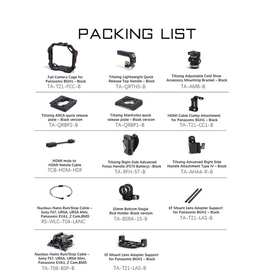 Sada Tilta TA-T21-C-B Camera Cage Kit C (černá) je kompletní modulární rig připravený k natáčení pro kameru Panasonic LUMIX BGH1/BS1H, který kombinuje minimalistický přední plný cage, 15mm LWS základovou desku s tyčemi, podporu EF adaptéru s EF bajonetem, ruční rukojeť Nucleus-Nano s pohonem řady L a R/S, držák monitoru s nastavitelným napětím, desky Arca + Manfrotto QR, kabel HDMI + svorka a držák na jednu tyč – vše, co potřebujete, abyste z BGH1 udělali plně vybavené filmové pracovní koně.