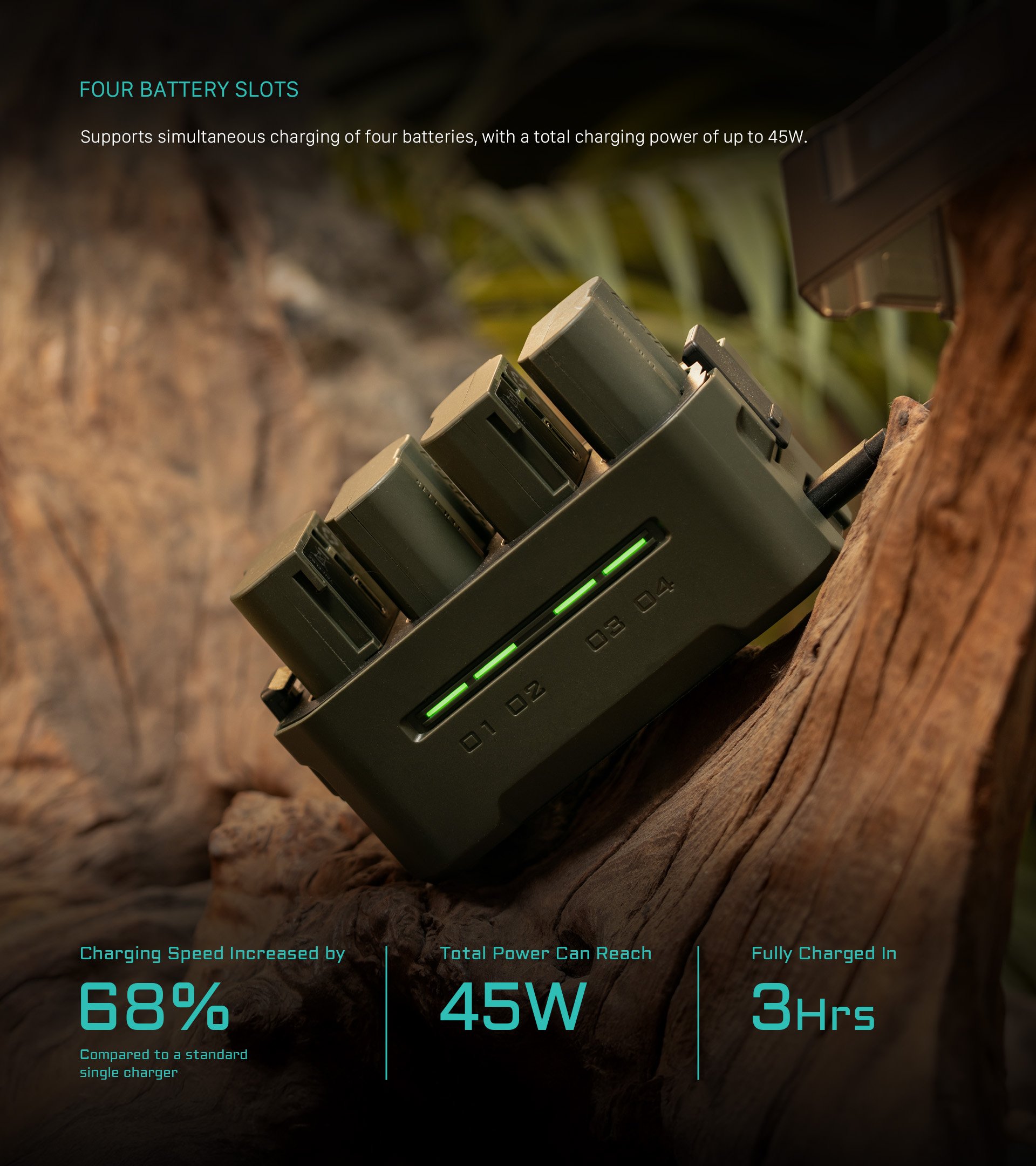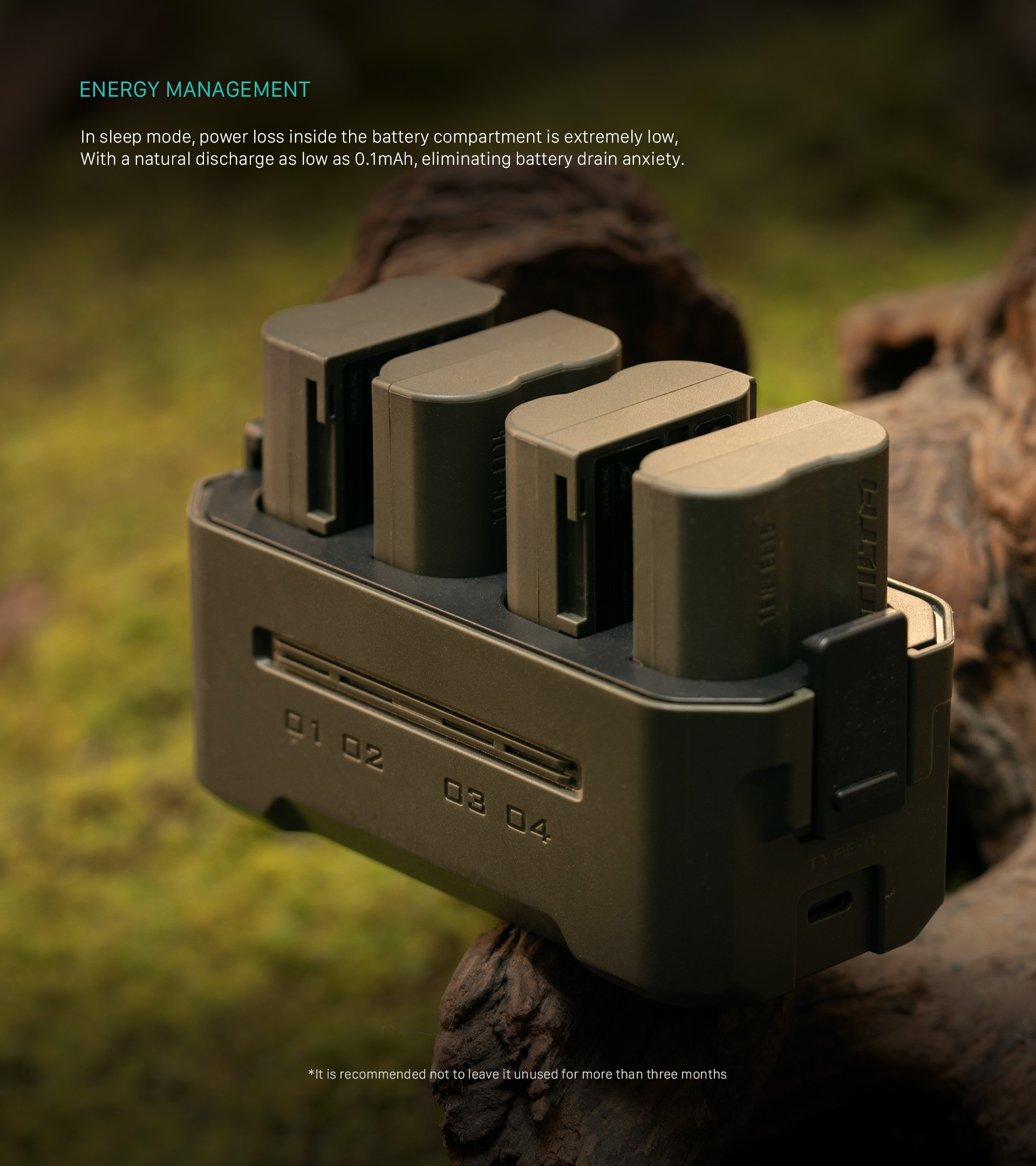 Tato kompaktní nabíjecí stanice je navržena pro podporu baterií EN-EL15C od společnosti Nikon a jiných výrobců a nabízí čtyři sloty pro snadné nabíjení a pohodlné skladování.