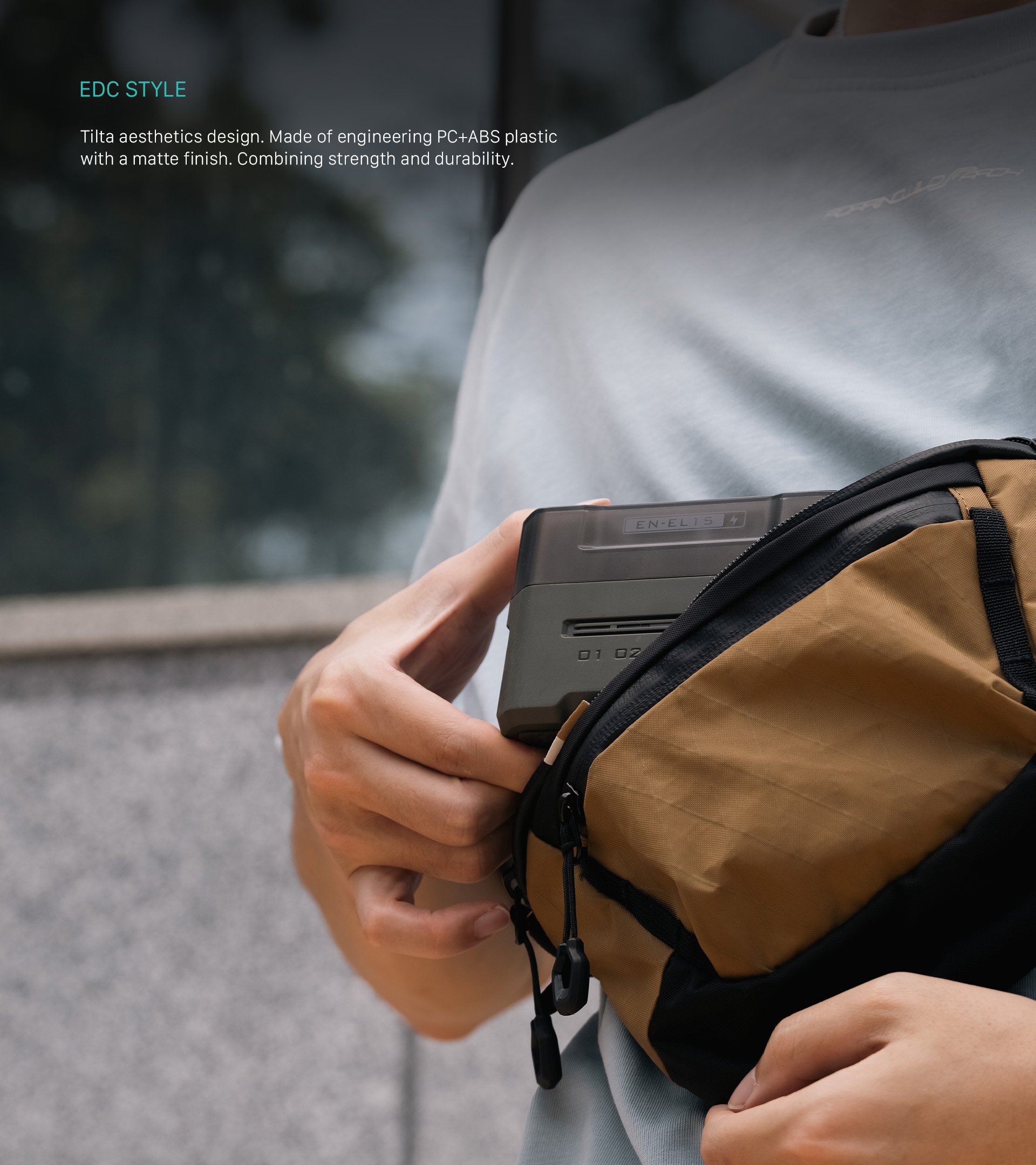 Přenosná nabíjecí stanice Tilta má design ve stylu EDC s charakteristickou estetikou značky Tilta, takže je stylovým a funkčním doplňkem vaší výbavy.