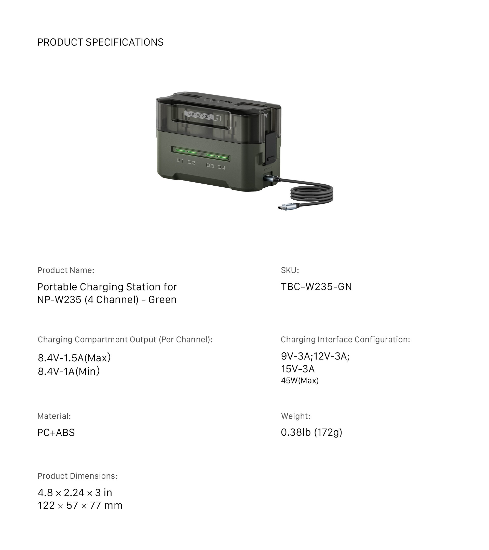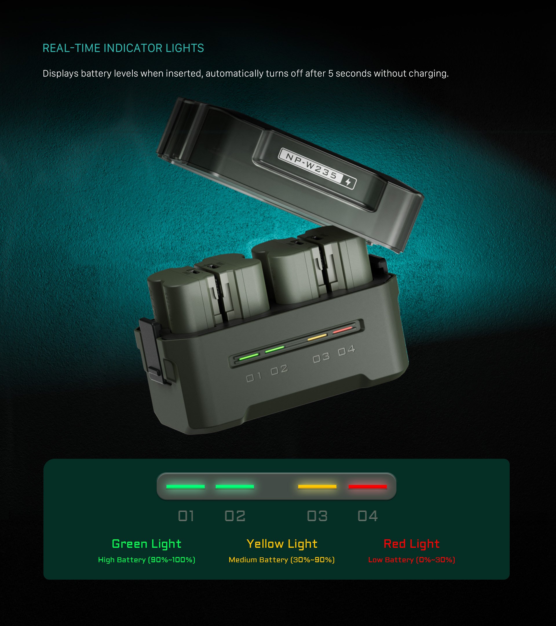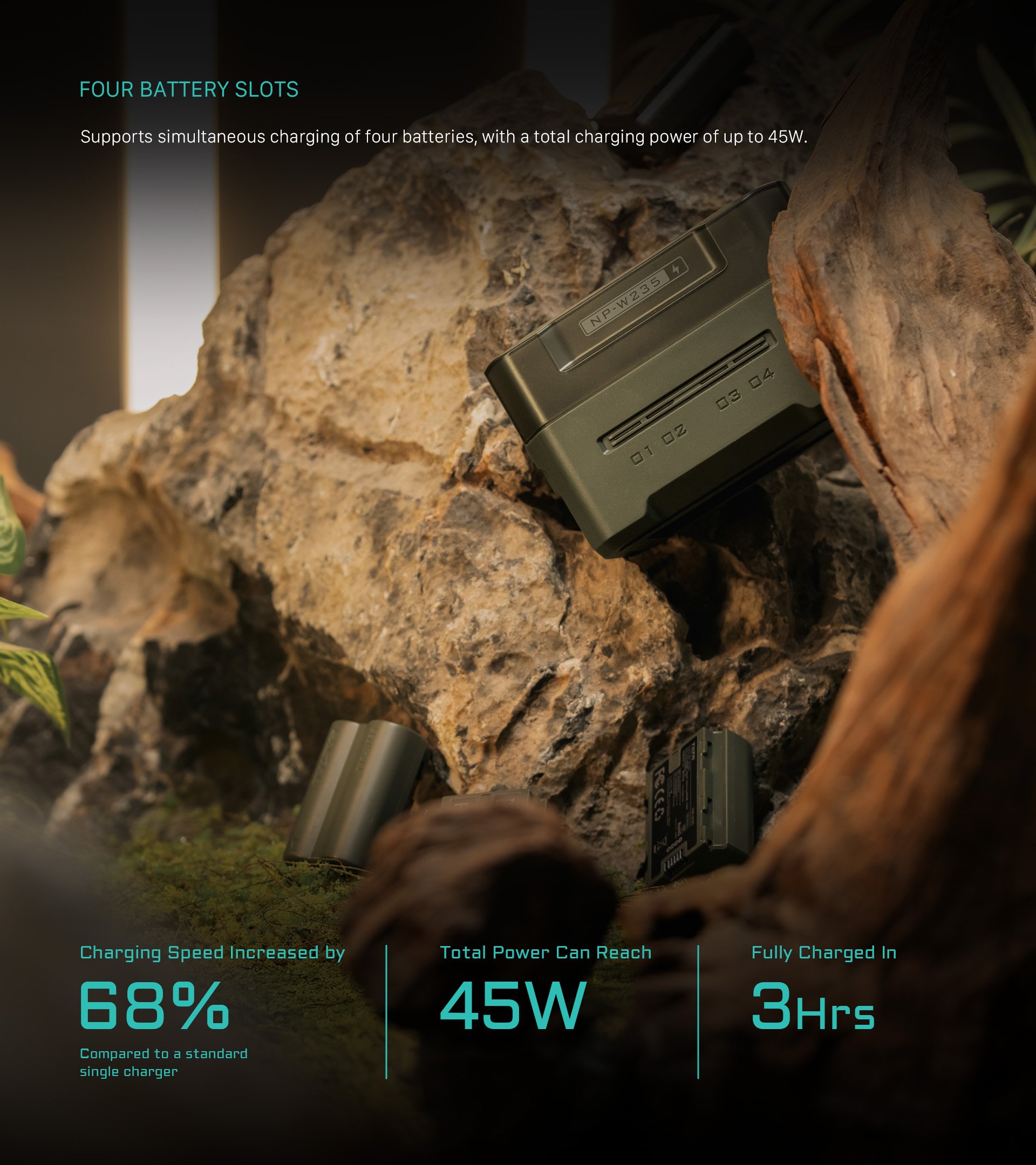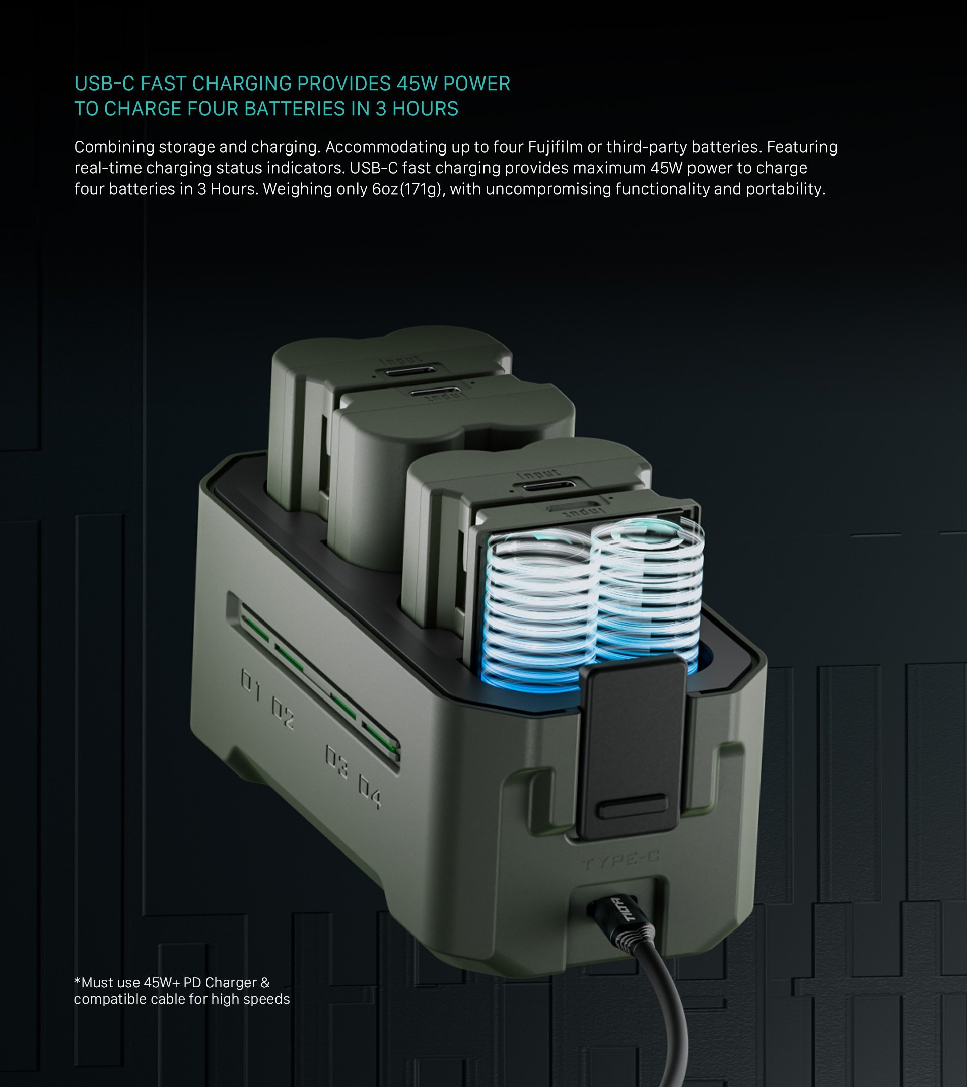 Tato kompaktní nabíjecí stanice je určena pro baterie Fujifilm a baterie NP-W235 jiných výrobců a nabízí čtyři sloty pro snadné nabíjení a pohodlné skladování.