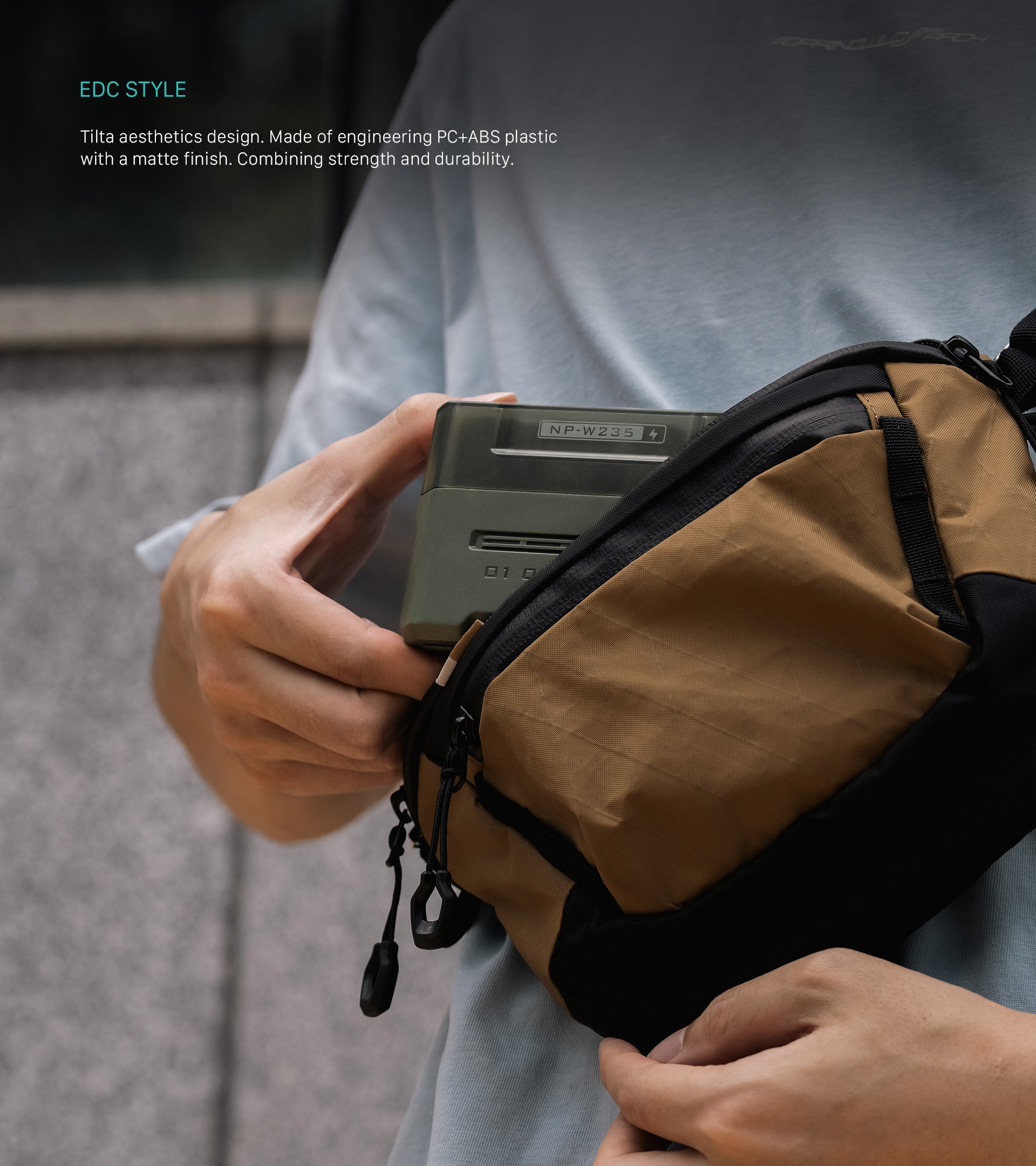 Přenosná nabíjecí stanice Tilta má design ve stylu EDC s charakteristickou estetikou značky Tilta, takže je stylovým a funkčním doplňkem vaší výbavy.