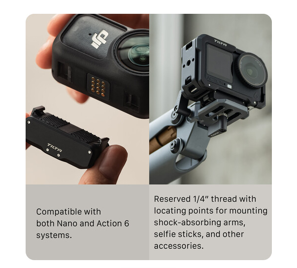 Rychloupínací montážní základna Tilta pro DJI Osmo Action 6 a Nano poskytuje rychlé, bezpečné a lehké montážní řešení pro tvůrce, kteří potřebují rychlost a flexibilitu v dynamických podmínkách natáčení. Tato základna, navržená speciálně pro DJI Osmo Action 6 a Nano, je vybavena magnetickým rychloupínacím spojem, který umožňuje okamžité připojení nebo odpojení kamery bez použití nástrojů.
