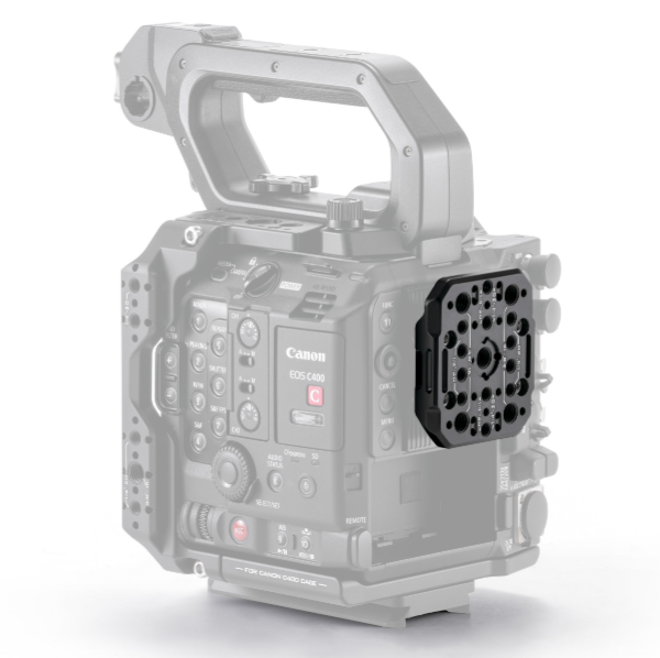 Tato univerzální zadní deska rozšiřuje možnosti upevnění kamery Canon C400 tím nejjednodušším možným způsobem. Je vyrobena z hliníkové slitiny pomocí CNC obrábění, má nerezové kování a matnou černou povrchovou úpravu. Bezpečně se připevňuje k zadním závitům kamery a nabízí mřížku závitů pro upevňovací kolíky podle standardu ARRI (1/4"-20 a 3/8"-16) pro pevné uchycení příslušenství. Integrované otvory pro popruhy umožňují bezpečné připevnění mini bateriových desek (například od společnosti Tilta), držáků SSD nebo vysílačů pomocí bungee nebo suchého zipu, aniž by se zvýšila hmotnost. S hmotností pouhých 0,5 lb přidává minimální váhu a zároveň výrazně zvyšuje funkčnost – je ideální pro dokumentární natáčení a gimbalová nastavení, kde by byla plná klec zbytečná, ale je nezbytné mít k dispozici další napájení nebo příslušenství.