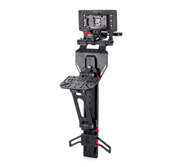 Držák Tilta Rear Seat Monitor Mounting Bracket Pro je určen k bezpečnému upevnění velkých monitorů a ovladačů na zadní sedadlo automobilu s kamerou. Připevňuje se k opěrce hlavy a je vybaven dlouhou podlahovou vzpěrou pro větší stabilitu. Horní část obsahuje kloubový montážní bod 1/4″-20 pro monitory a integrovanou bateriovou desku V-Mount pro napájení zařízení. Tento odolný držák je ideální pro montáž větších řídicích systémů, jako jsou například Master Wheels od společnosti DJI.