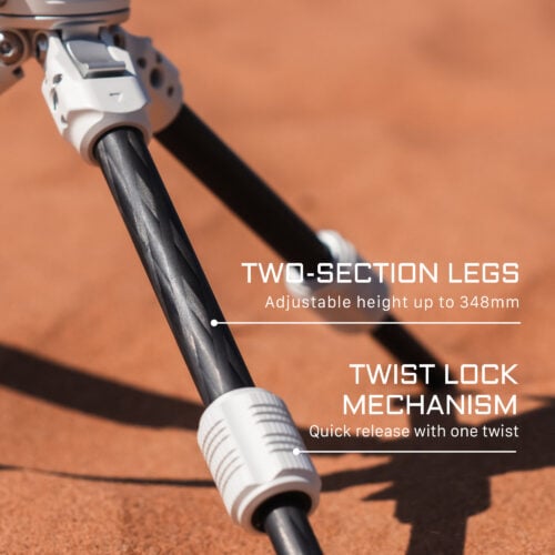 Jeho dvoudílné nohy se vysouvají až na 13,7″ a mechanismus s otočným zámkem usnadňuje rychlé a přesné nastavení výšky. Pro větší výšku lze stativ doplnit volitelnou prodlužovací tyčí.