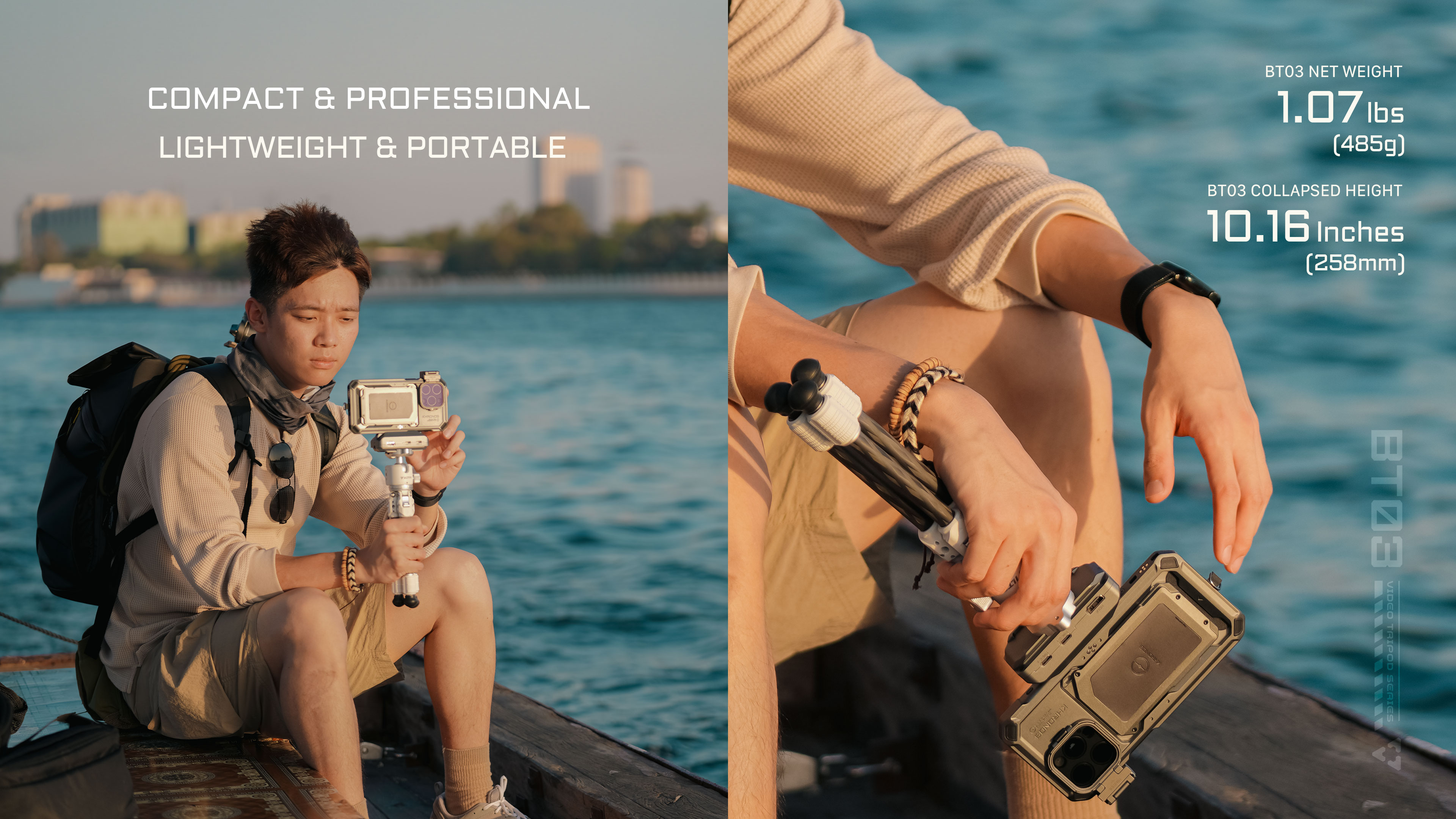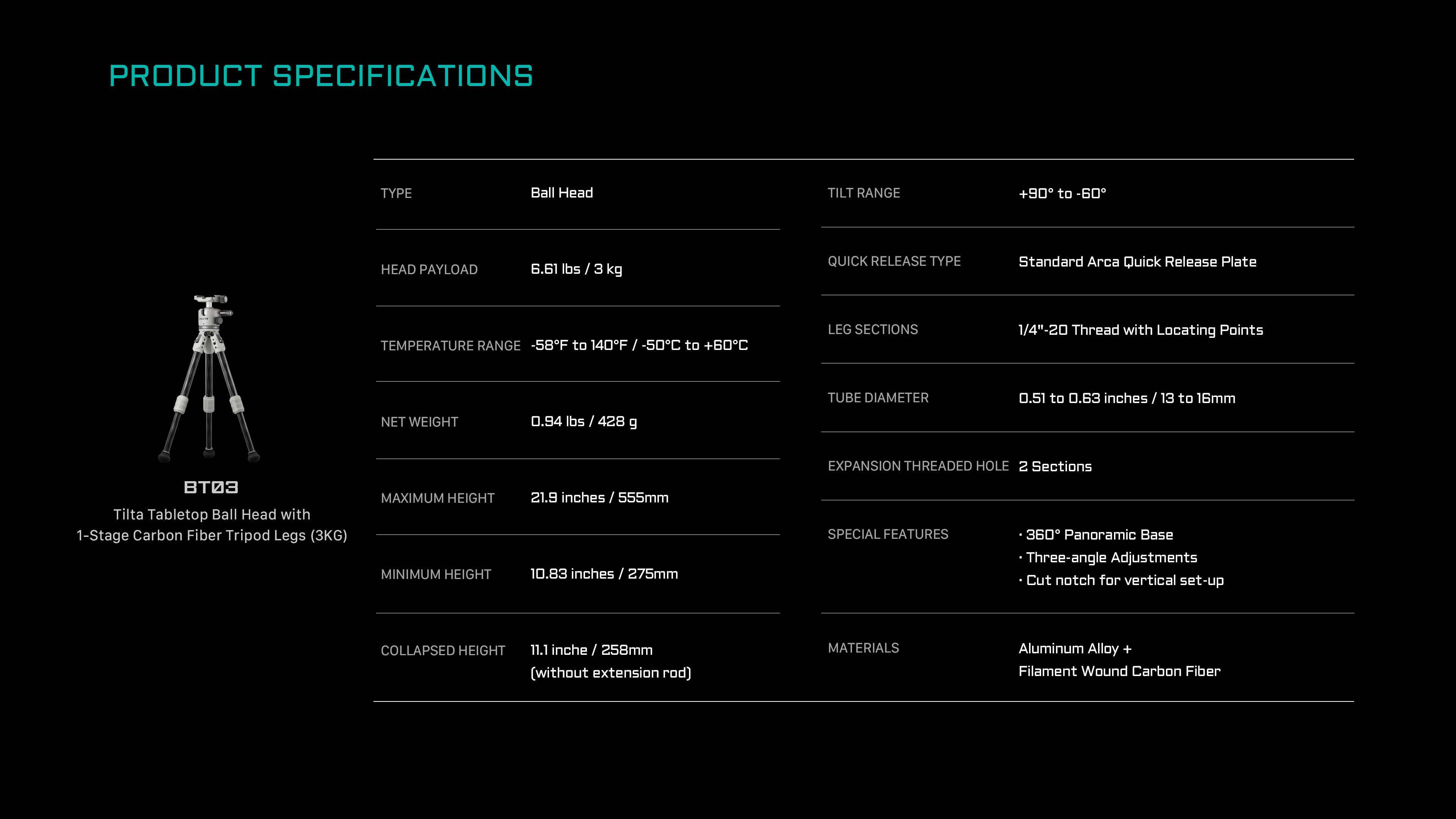 BT03 je vybaven robustní kulovou hlavou, která unese až 6,6 lb / 3 kg, a obsahuje slot pro vertikální fotografování v úhlu 90°, což umožňuje plynulý přechod mezi horizontální, vertikální a nadhlavní konfigurací.