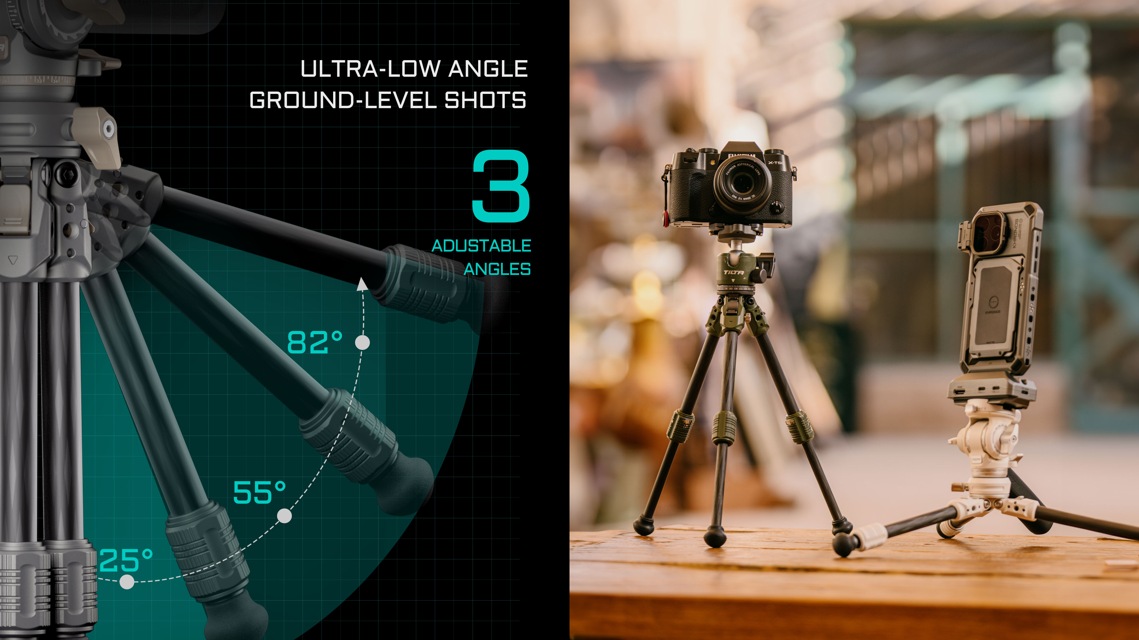 Díky elegantnímu designu bez středového sloupku vyniká tento stativ v omezených prostorech a při snímání z nízkého úhlu. Schopnosti stativu pro snímání z extrémně nízkého úhlu jsou vylepšeny třemi nastavitelnými úhly nohou, které umožňují kreativní pohledy z různých perspektiv.