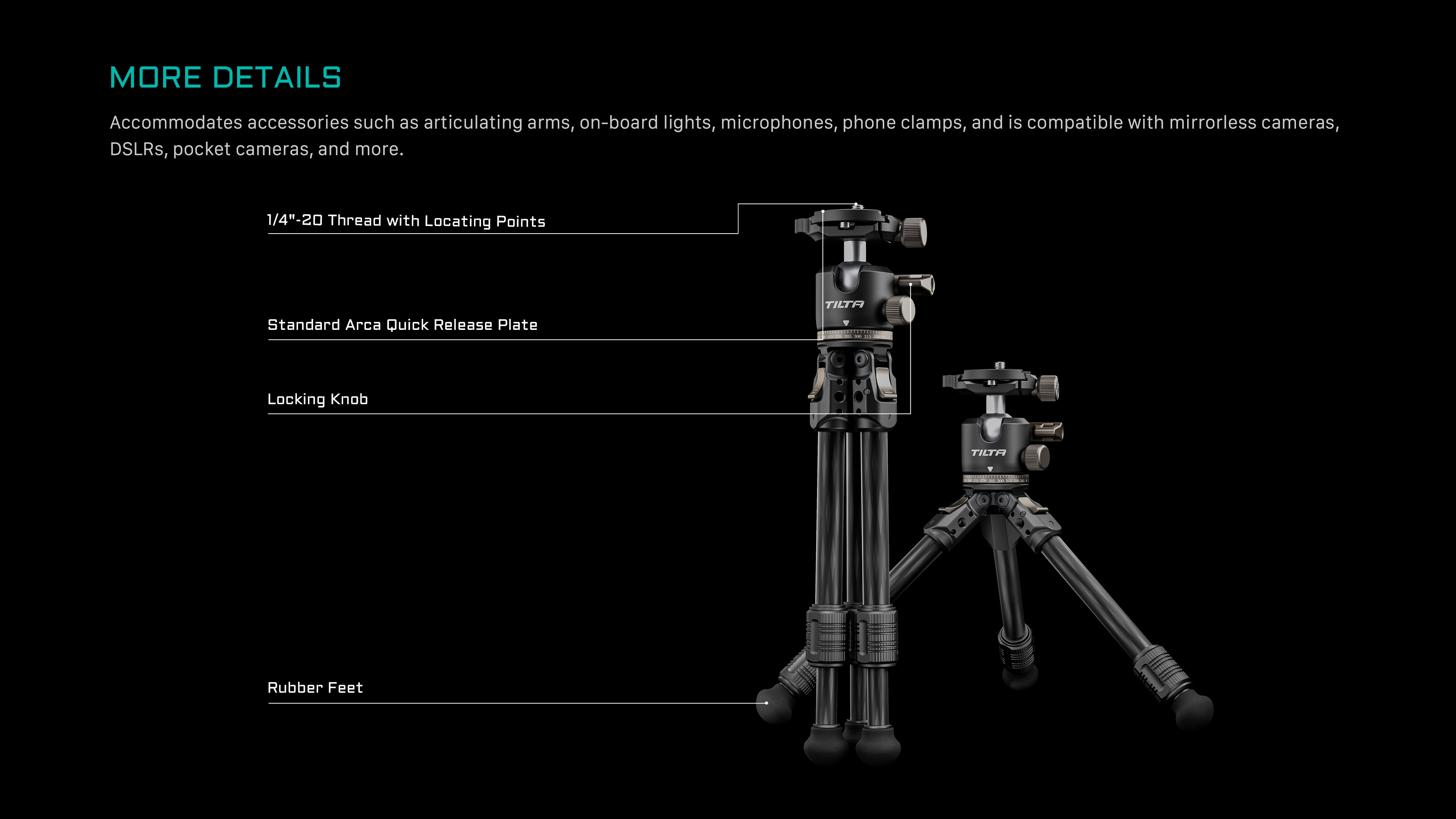 Rukojeť je navíc teleskopická a lze ji nastavit do různých délek pro větší pohodlí, zatímco nohy jsou vybaveny 1/4″-20 upevňovacími body s polohovacími kolíky, které uživatelům umožňují připevnit různé příslušenství.