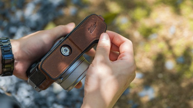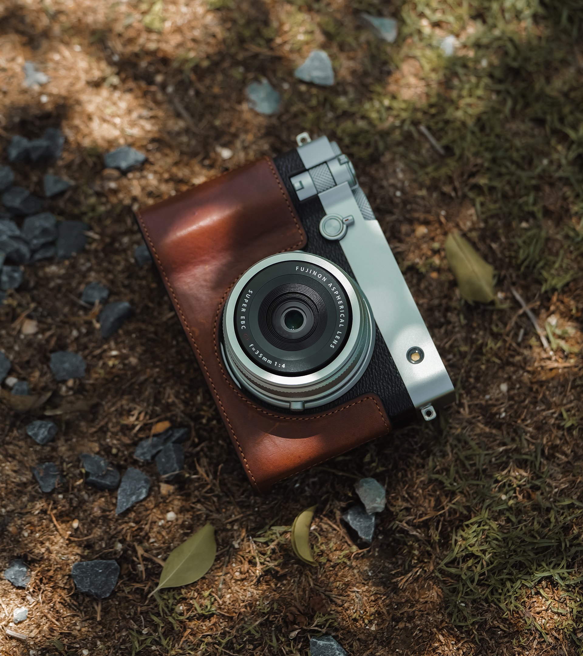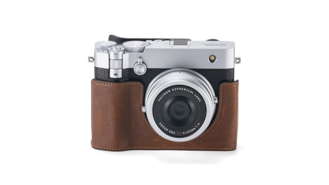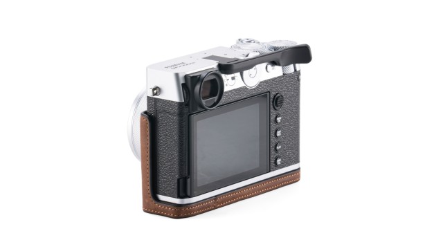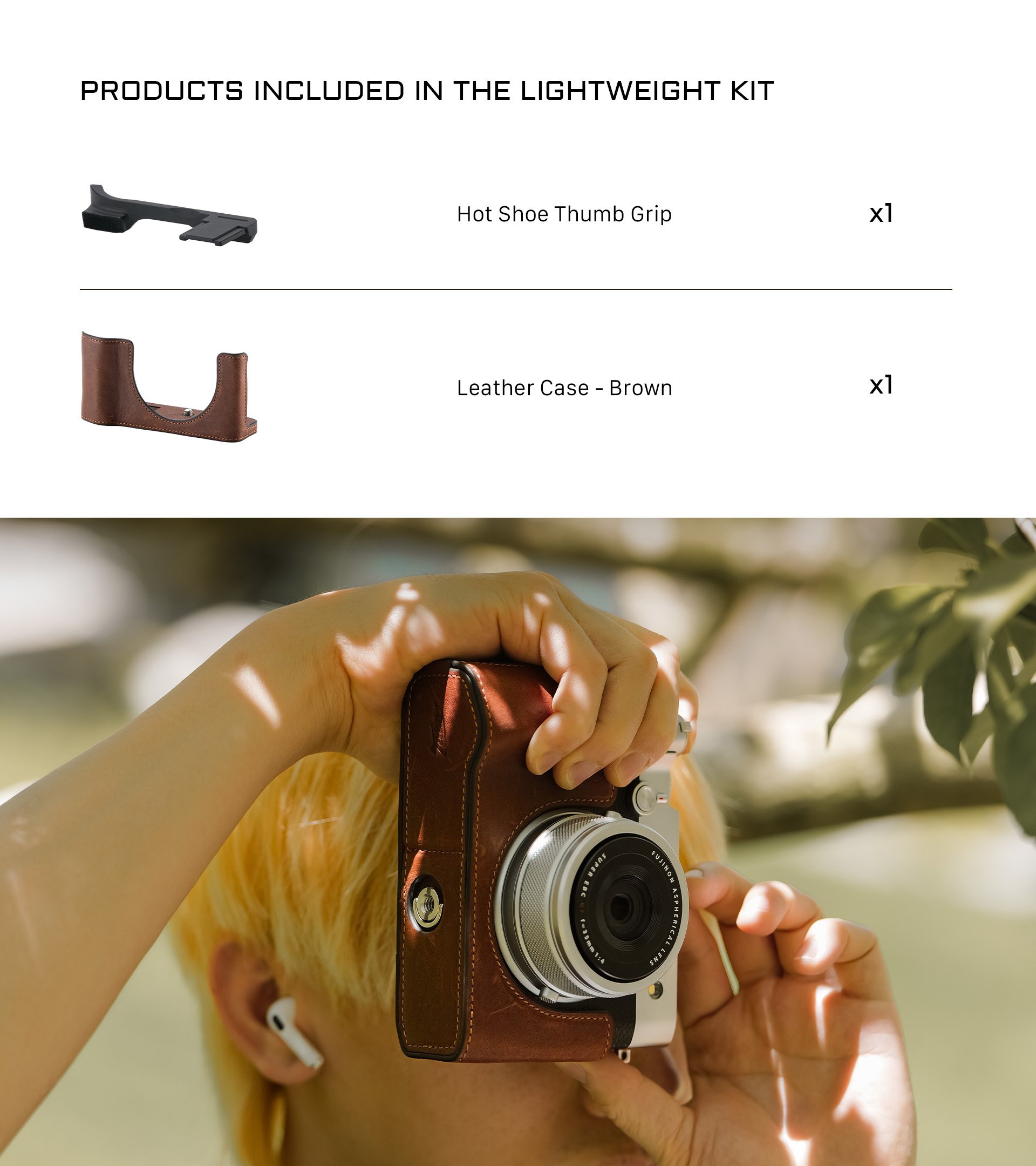 Tato sada obsahuje kožené pouzdro na fotoaparát Fujifilm GFX100RF, které se připevňuje pomocí šroubu 1/4″-20 a poskytuje uživatelům pohodlnější způsob ovládání a manipulace s tělem fotoaparátu díky integrované rukojeti.