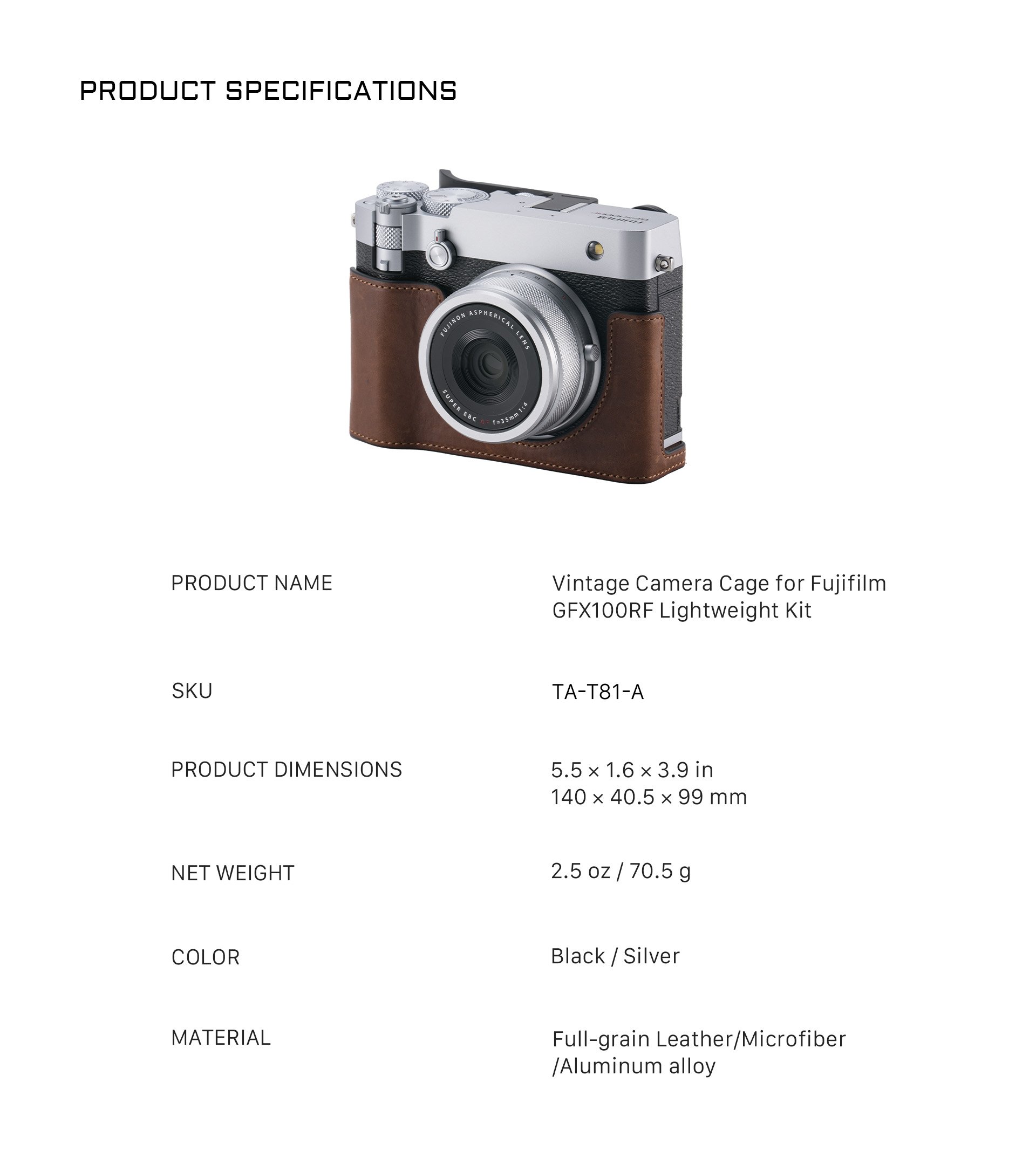 Představujeme Vintage Camera Cage pro Fujifilm GFX100RF Lightweight Kit. Tato sada obsahuje kožené pouzdro na fotoaparát Fujifilm GFX100RF, které se připevňuje pomocí šroubu 1/4″-20 a poskytuje uživatelům pohodlnější způsob ovládání a manipulace s tělem fotoaparátu pomocí integrované rukojeti.