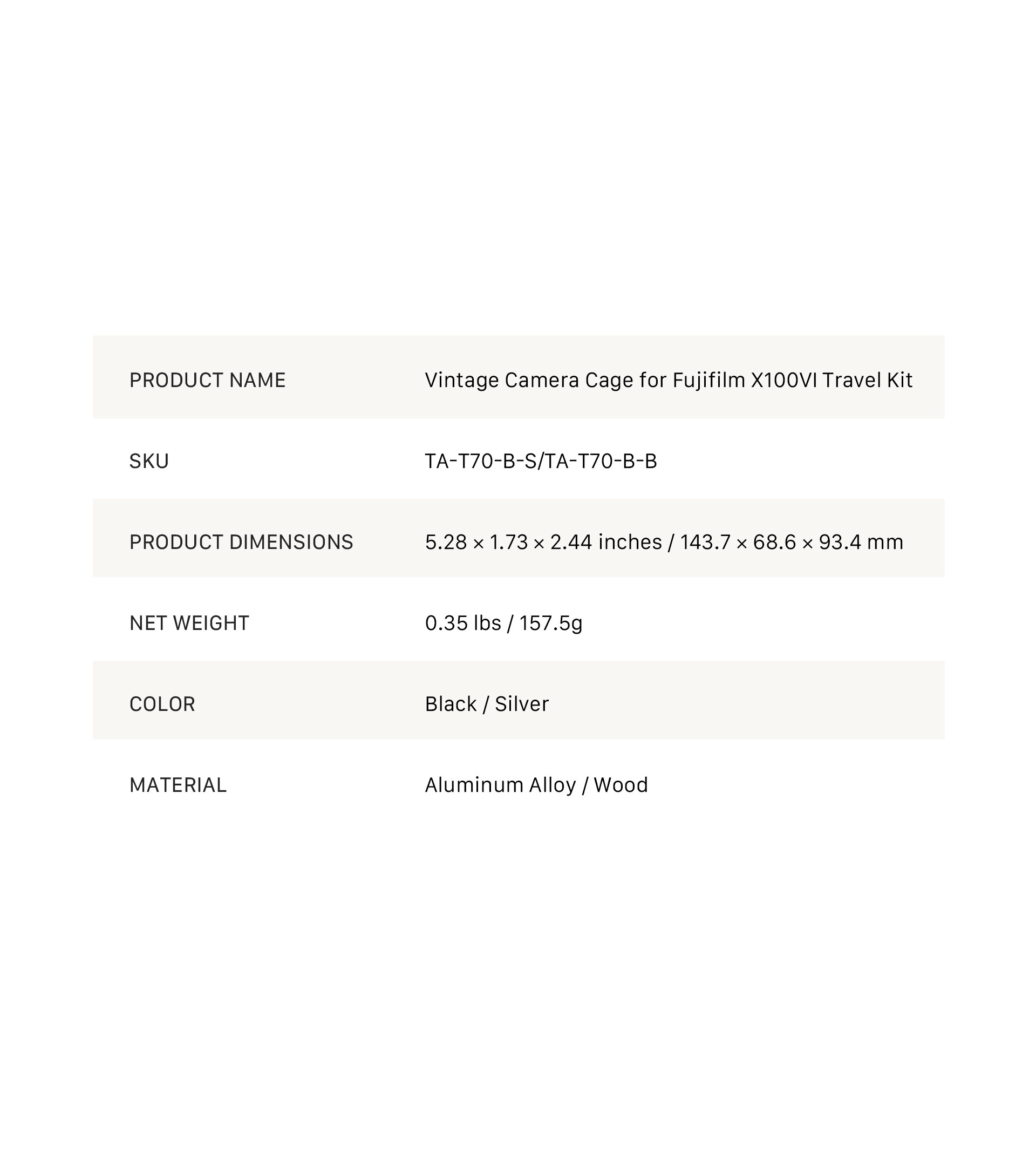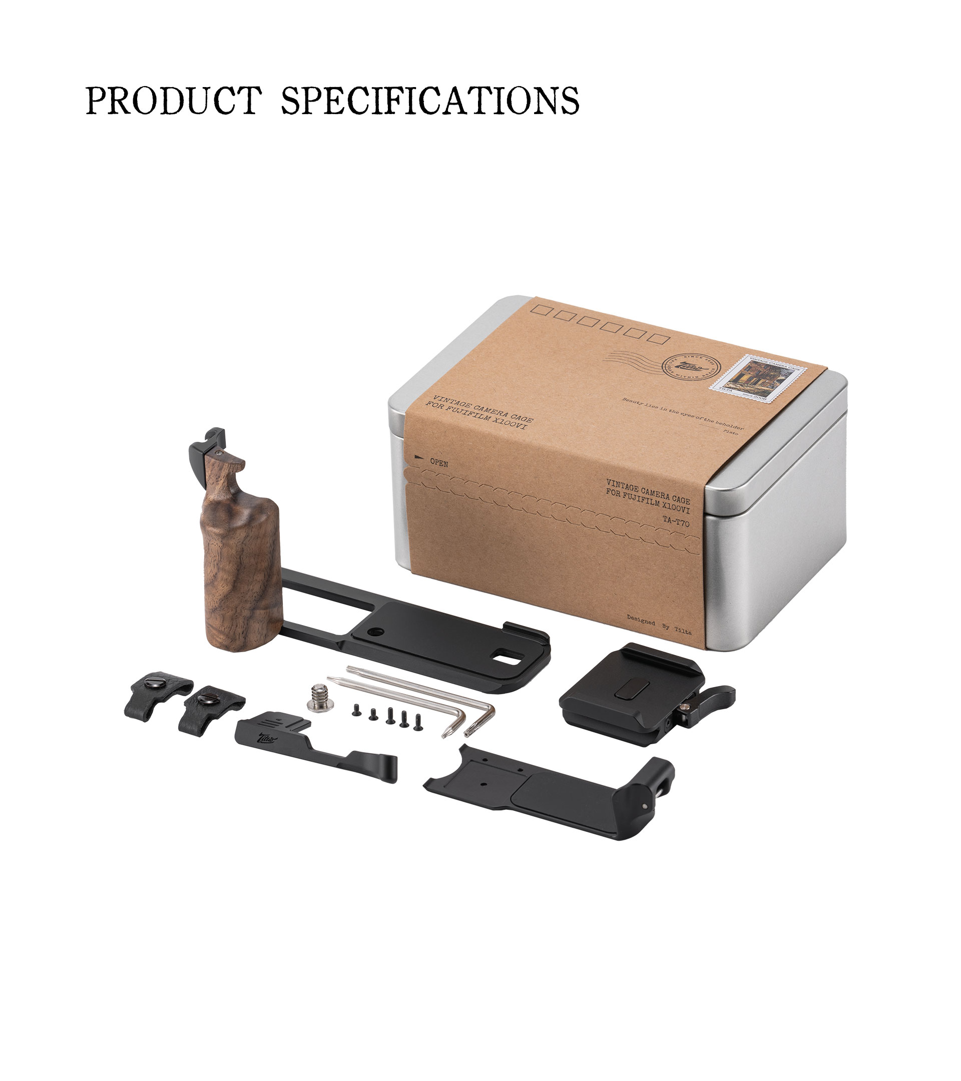 Představujeme Vintage Camera Cage pro cestovní sadu Fujifilm X100VI. Tato sada obsahuje řadu lehkého příslušenství, které zlepšuje funkčnost fotoaparátu X100VI a zároveň zachovává kompaktní, ale výkonný systém. Základem této sady je L-Bracket s dřevěnou rukojetí vyrobenou z ořechového dřeva, která poskytuje pohodlnější způsob ovládání a manipulace s fotoaparátem.