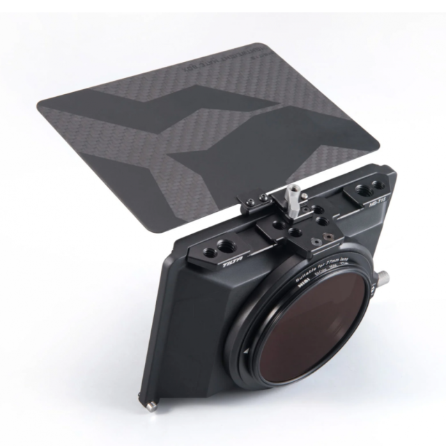 Další výhodou tohoto matného boxu jsou dvě možnosti filtru. Na přední straně matného boxu je slot pro jakýkoli standardní filtr 4 × 5,65. Šroubovací filtry lze k adaptérovým kroužkům připojit pomocí vnitřních závitů, které odpovídají průměru každého adaptérového kroužku. Adaptační kroužek je připevněn k objektivu, vy můžete nasadit matný box a poté použít šroubovací filtr. Sada obsahuje mini matte box, francouzskou vlajku a čtyři adaptační kroužky (82 mm, 77 mm, 67 mm a 72 mm). Nabízíme také další adaptérové kroužky v nestandardních velikostech (52 mm, 55 mm, 58 mm, 62 mm, 85 mm) a také adaptérové kroužky ve verzi pro kinofilm (80 mm a 85 mm).